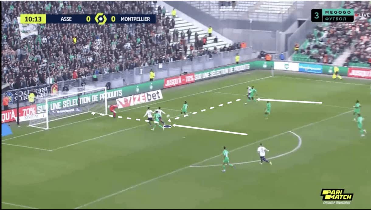 With Der Zakarian likely to get the team dropping off more in defensive phases, thus opening up more space behind the opposition’s backline to exploit on regaining possession, and if he can influence some improvement on the ball progression side of things, Montpellier should be able to create more and more opportunities to find Wahi with balls in behind targeting this space and the player’s movement.
