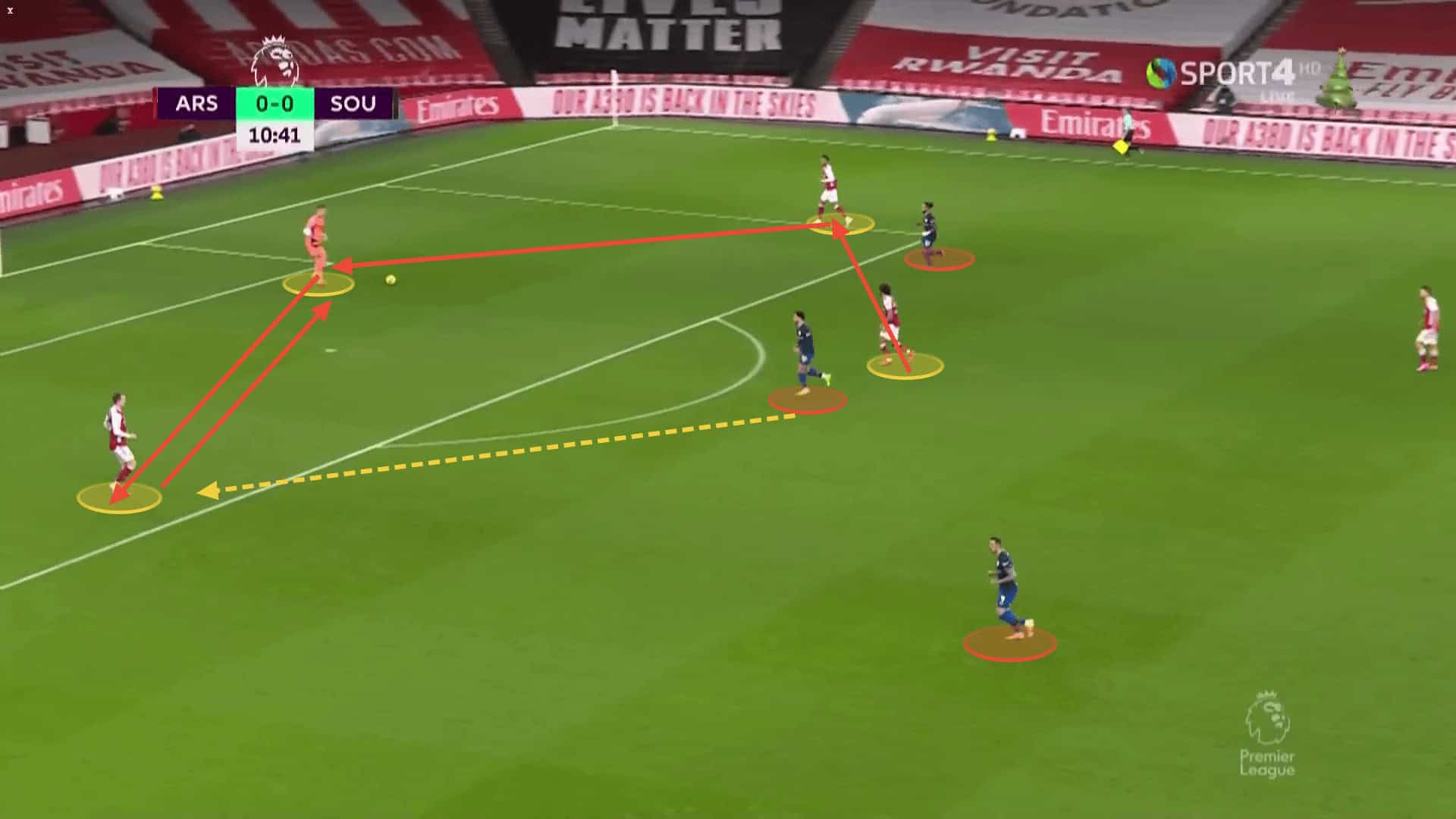 In the above example. Southampton would apply high press and constantly force Arsenal in sending the ball back. Due to Arteta’s possession-based approach, they preferred circulating the ball at the back (killing the tempo and their chances for an attack) instead of risking losing possession with a long ball. This wouldn’t help Arsenal in bypassing the press and creating goalscoring opportunities.