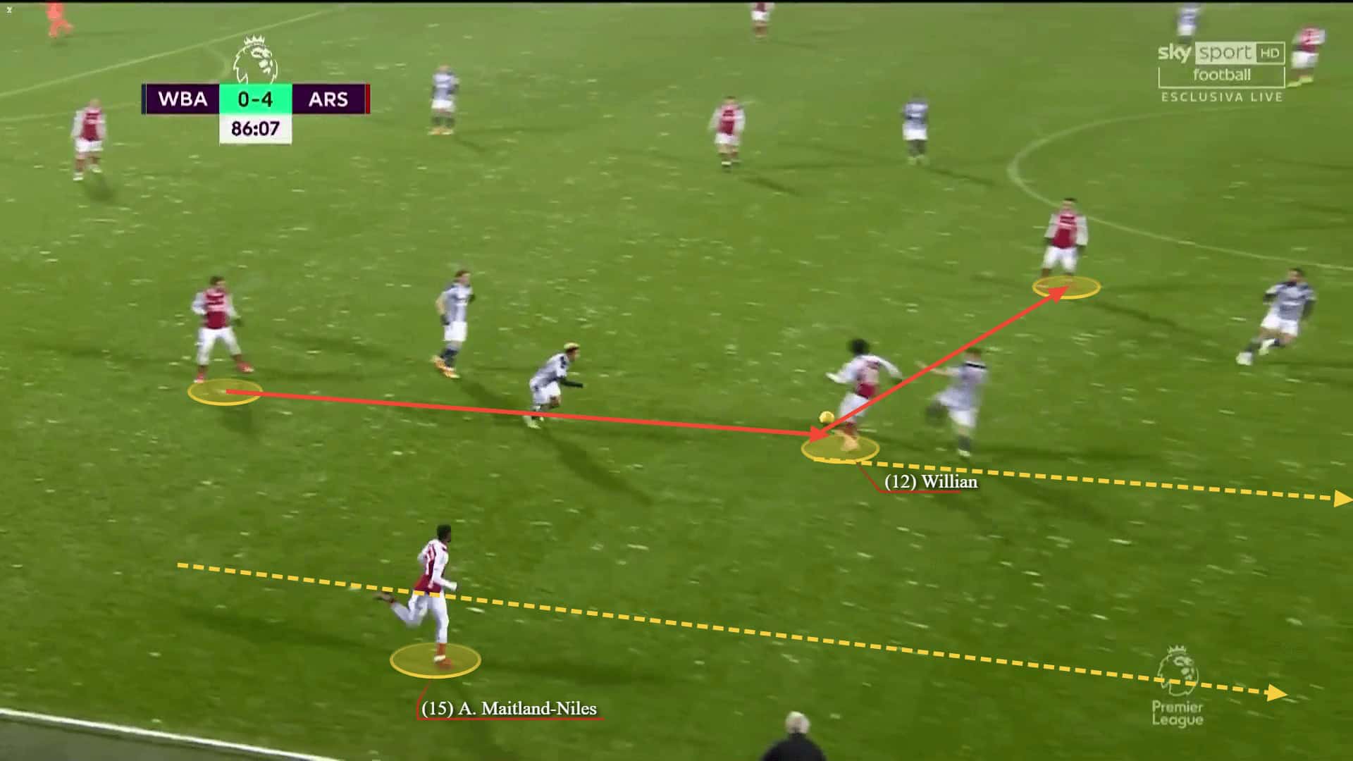 Playing in a 4-2-3-1 suggest that the team could both play with width but also have good coverage of the central areas. With Arsenal though, due to the lack of a skilful attacking midfielder, they would either fail to use the half-spaces or the wide areas. Let’s get Willian and his position as a winger as an example. The Brasilian usually helps a lot with ball progression and helps a lot with creativity and both staying outside and cutting inside. What doesn’t allow him to show his true colours now is that he doesn’t have the freedom to move around and there are no players to combine with. Part of the reason is the lack of versatility in the squad and lacking players with different strengths who can fulfil different roles.