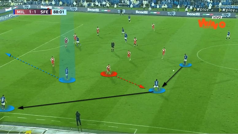 The left-forward, from the half-space, initially makes a run straight towards the ball, brushing past the widest opposition midfield player. With the midfielder now tracking him, the forward makes a sharp turn inside the pitch.