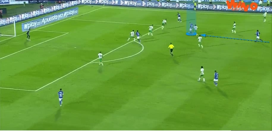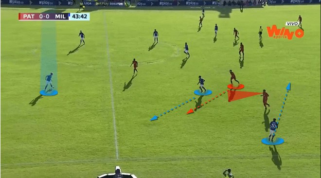 Millonarios’s right back occupies the opposition’s left-midfielder. He does this by making a double movement – initially moving towards the ball, engaging the left-midfielder, then making a forward run to push the midfielder back towards his own goal.