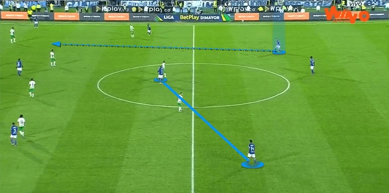 Millonarios use their full-backs in a variety of intelligent ways. Often, they move inside the pitch with their wide forwards providing the width. The above image shows the left-back, number ‘3’ Omar Bertel, in the half-space as the ball is about to be switched from right to left.