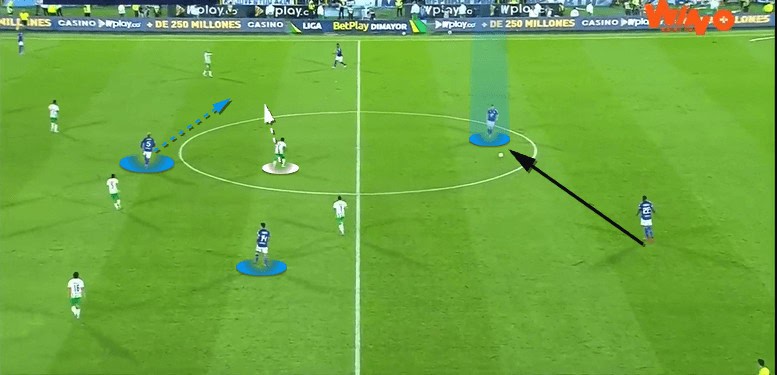 Bertel’s run in the half-space means the opposition right-back is also pinned. Both these movements combine to allow the left-forward to receive in space. With more than enough time to take a touch and get his head up, the left-forward provides a pinpoint cross. Bertel, who has continued his run into the box, flicks the cross on to provide an assist for Millonarios’s winning goal.