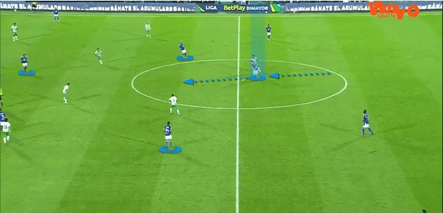 An important part of Millonarios’s build-up play is the willingness of their centre-backs to dribble out from the back. Their ability to do this allows them to break lines with the ball at their feet and disrupt the opposition’s defensive block.