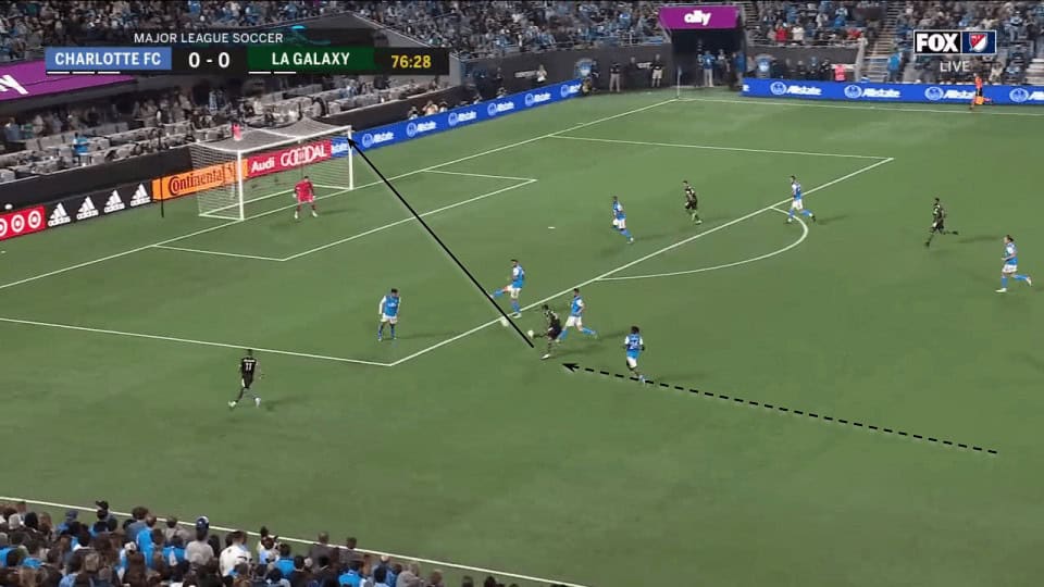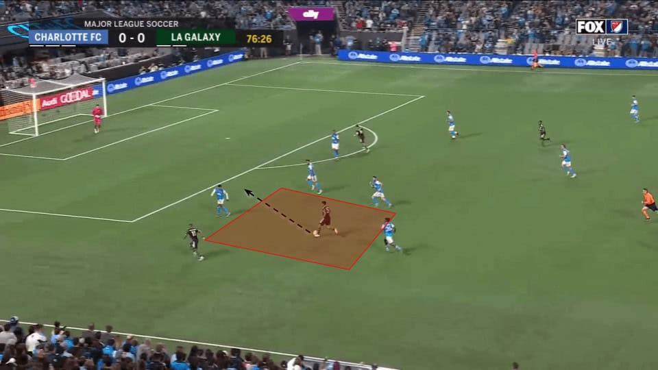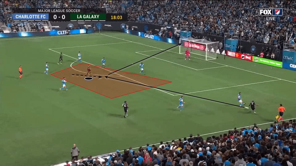 The other situation that happens often and is quite similar is the one below in which we see LA Galaxy’s goal in Charlotte’s 1-0 defeat. The play starts with a rival midfielder comfortably in possession with no one around him so he can turn and find a pass forward. As the player receives the ball in the left half-space, it isn’t clear who has to mark him as it could be the returning midfielder, the defensive midfielder, the full-back on that side or the centre-back on that side. As no one steps out to stop him, the player advances and shoots from the edge of the box without much opposition, scoring a great goal.