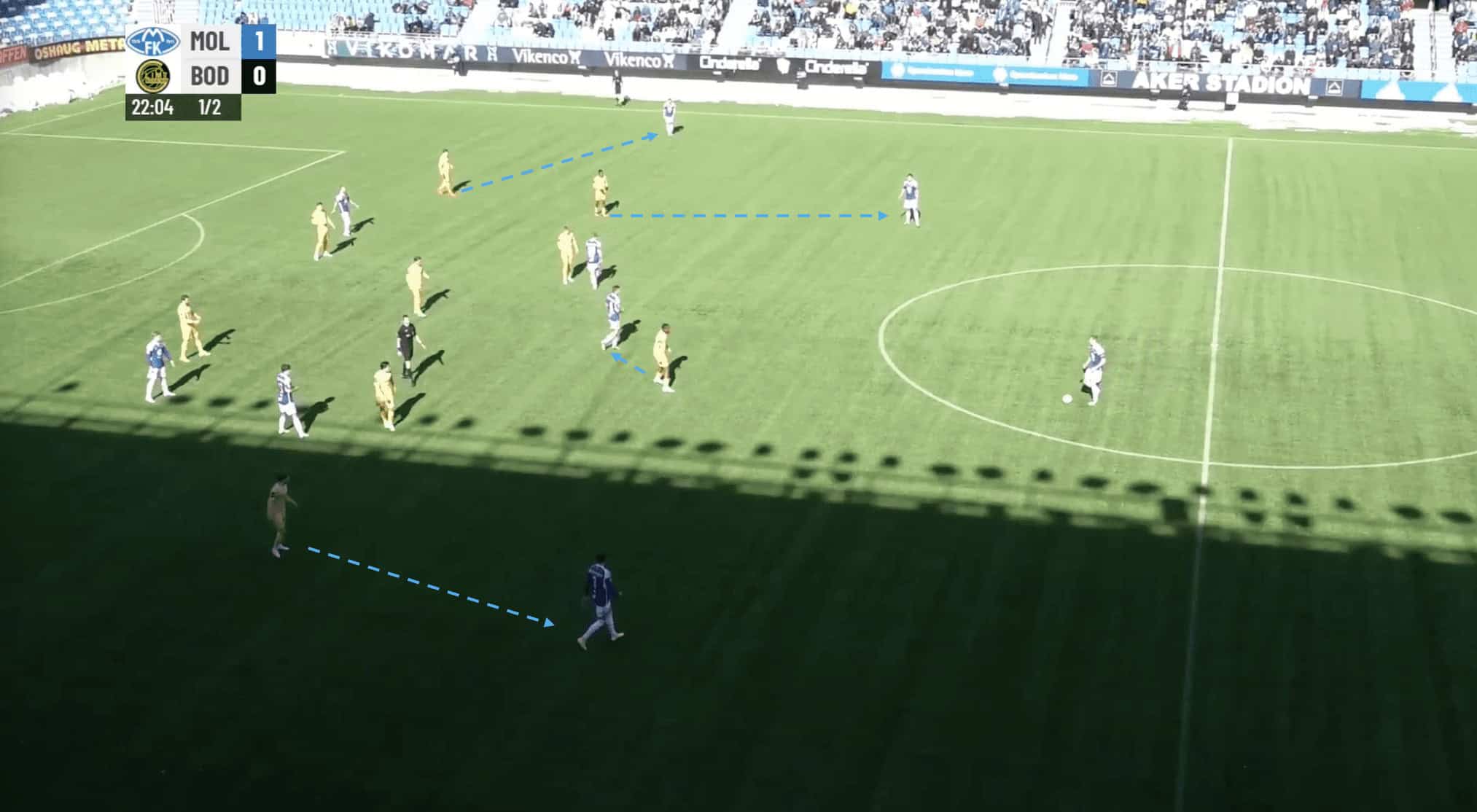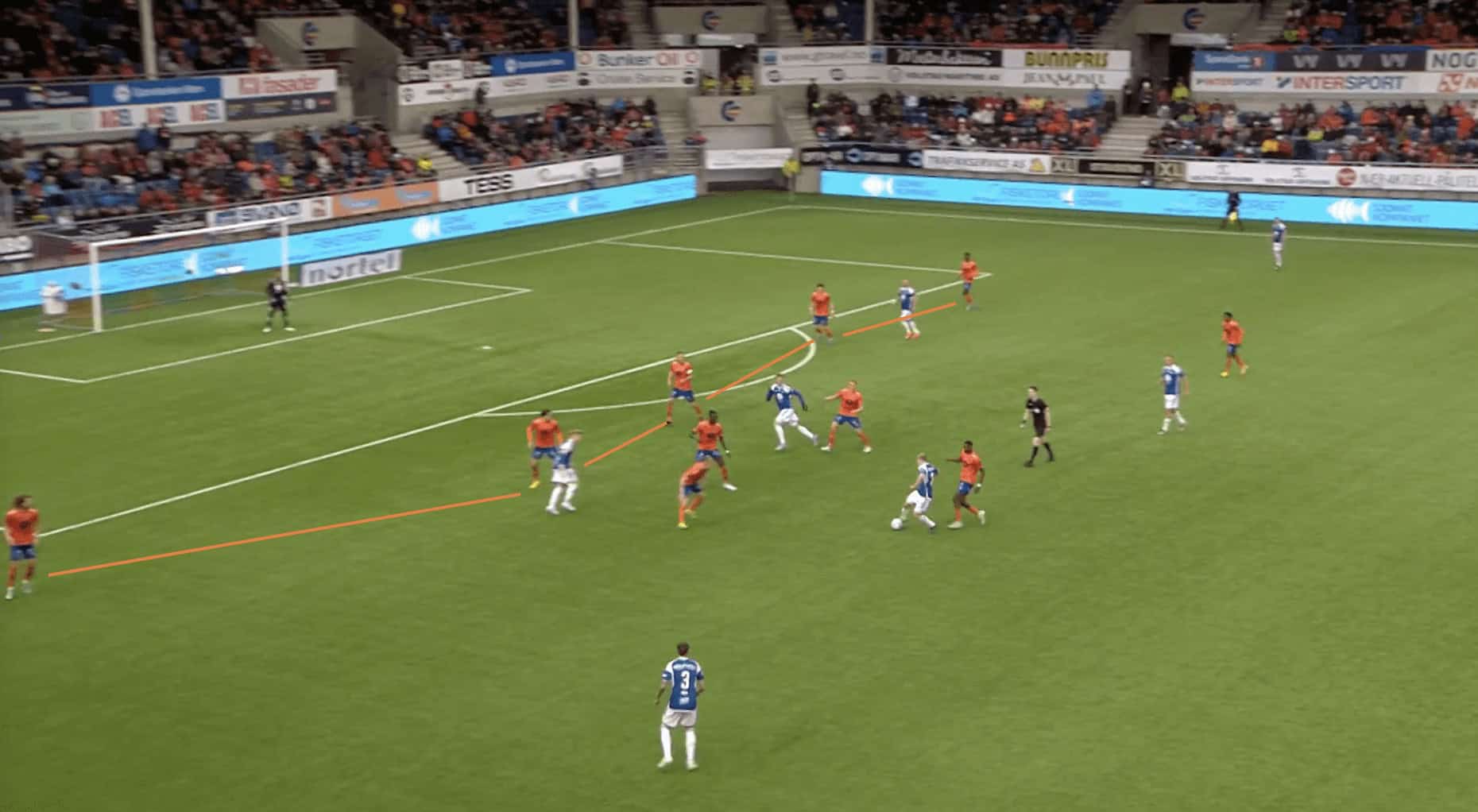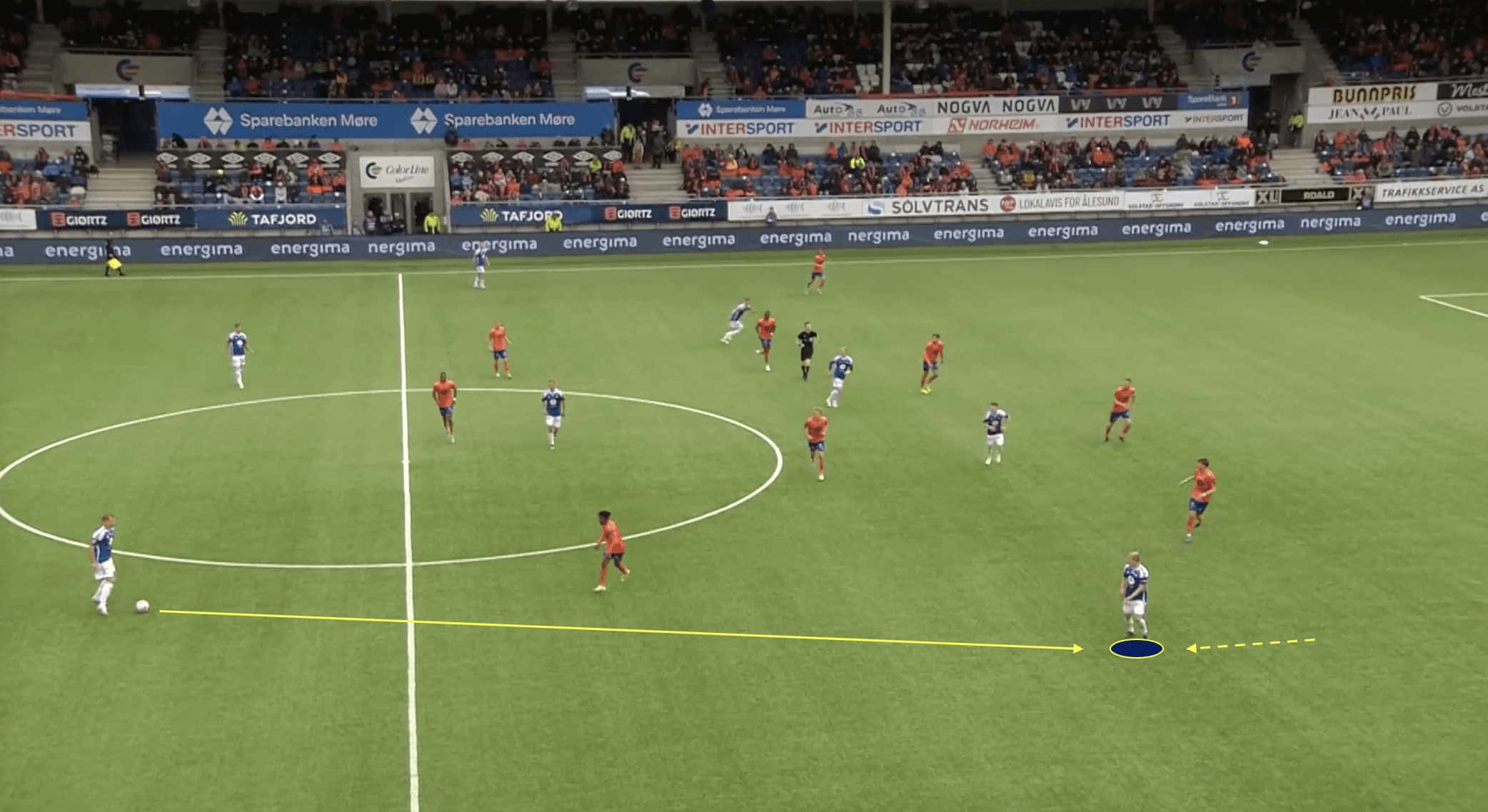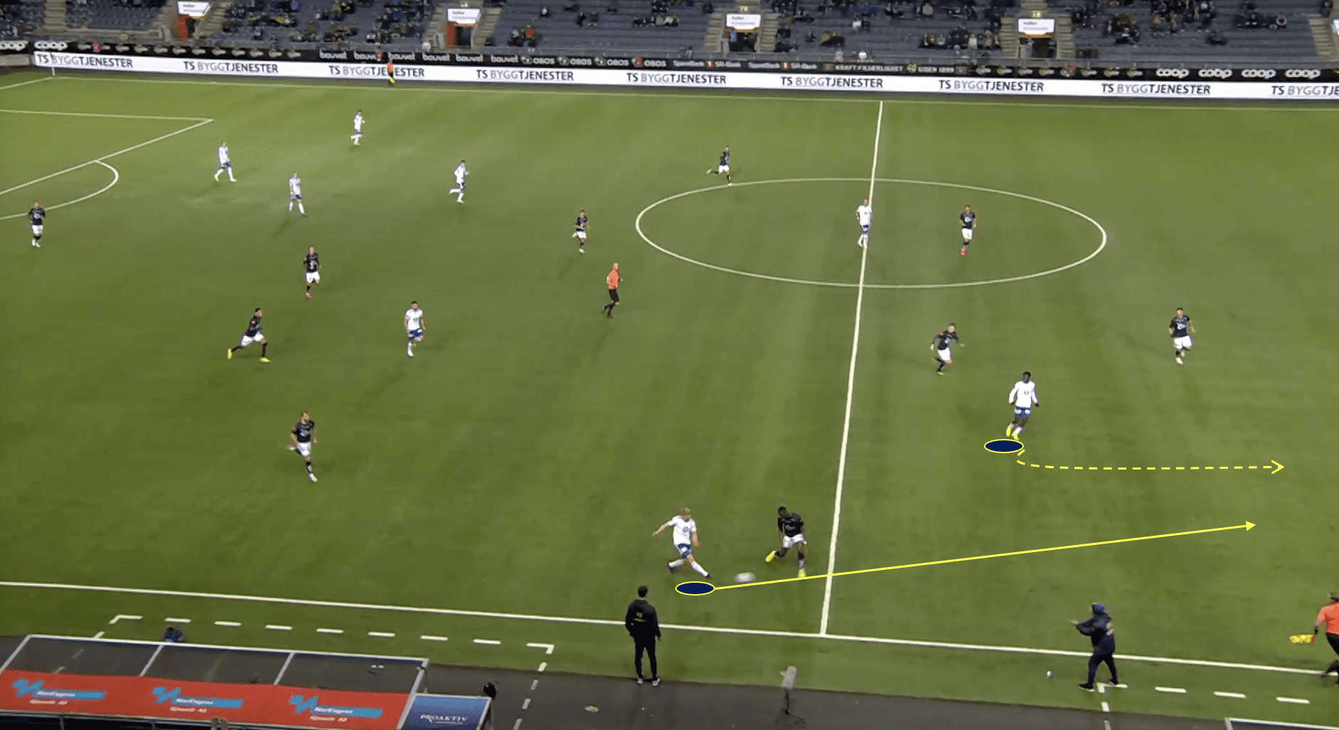 Without players making runs behind the defensive line, the opposing defenders can easily maintain a compact shape and deny the attacking team any gaps or spaces to exploit, as we can see above. They can focus their attention on marking the players in front of them, knowing that there is no immediate threat of a player running behind them. This makes it difficult for the Molde team to break through the defensive line and create scoring chances.