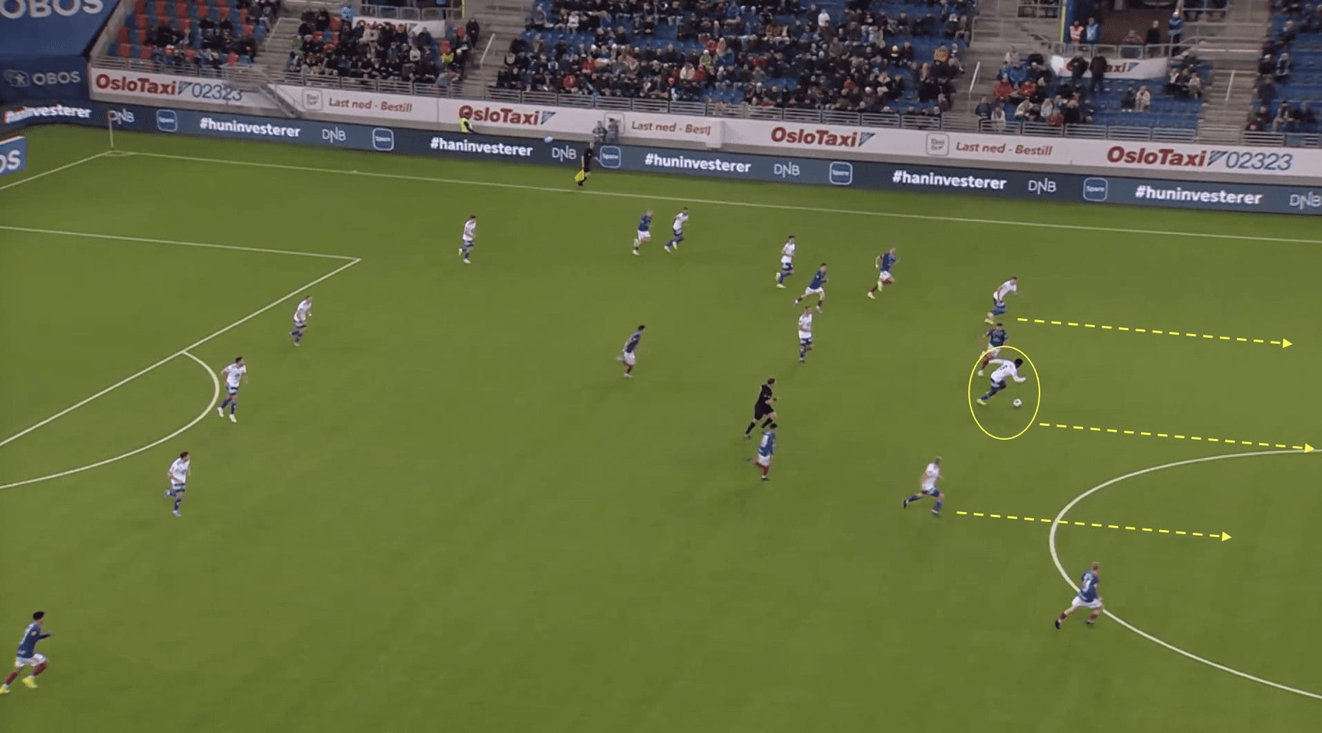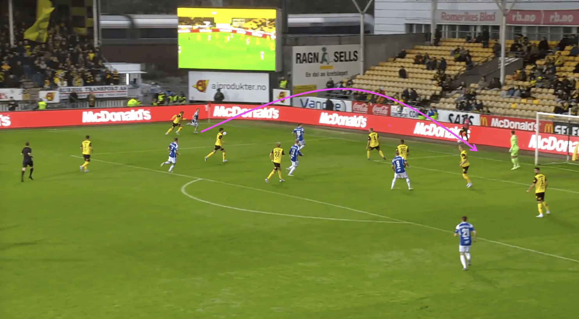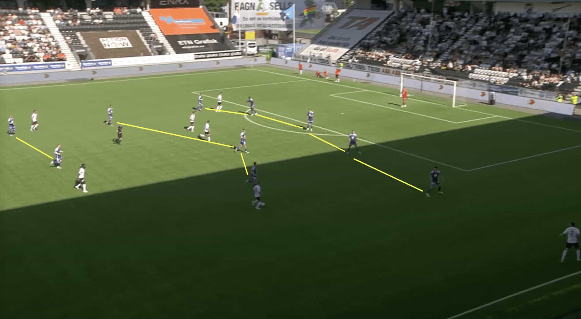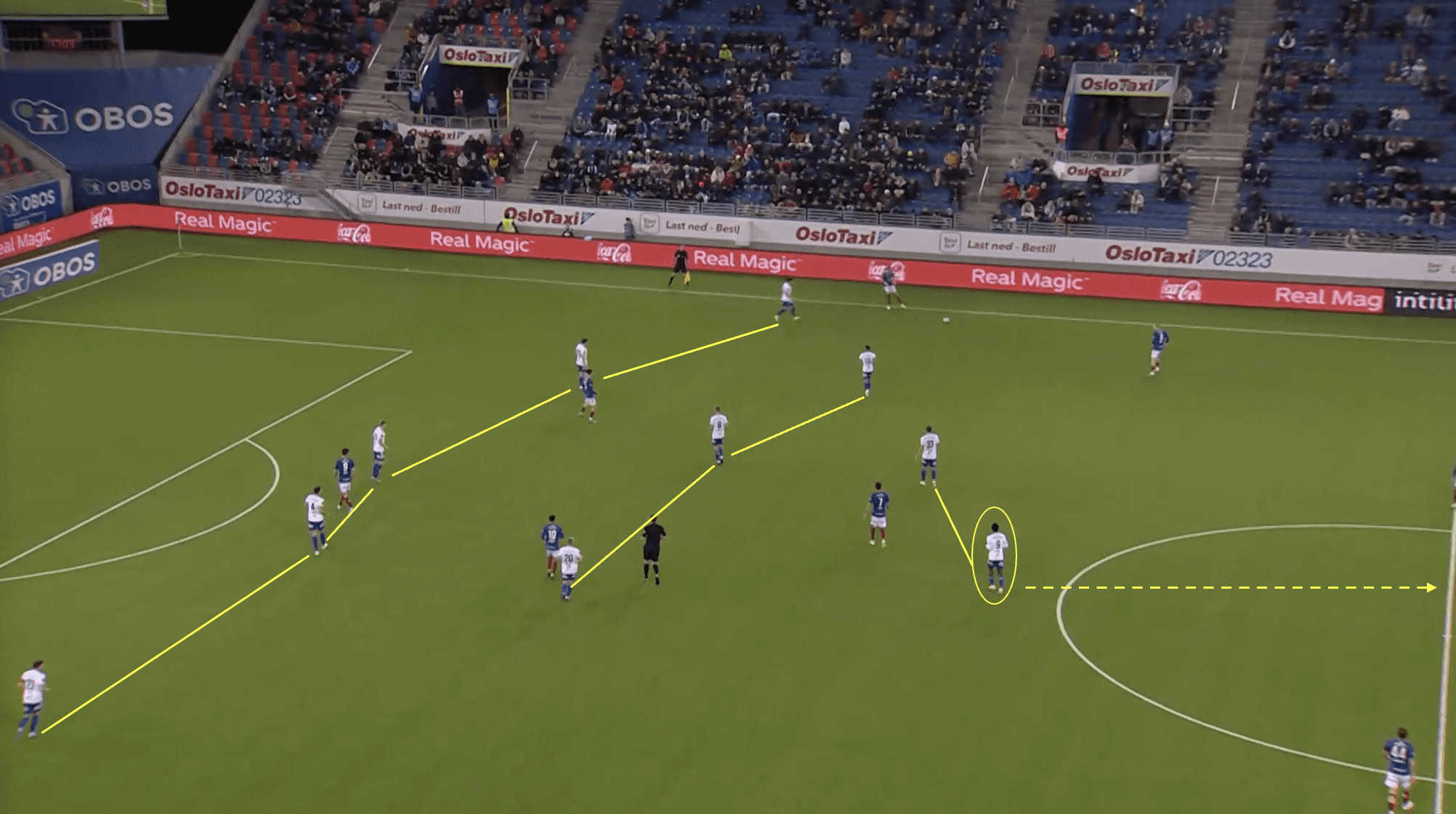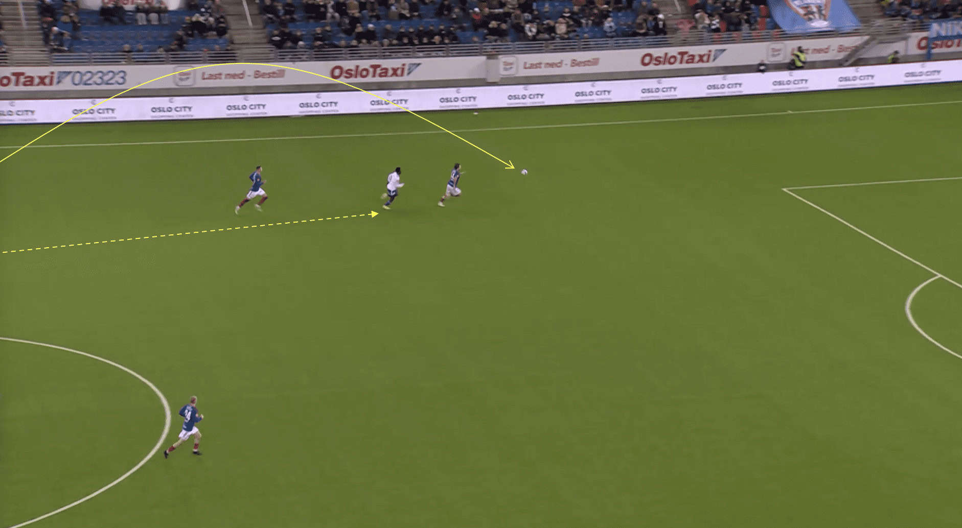 Without players making runs behind the defensive line, the opposing defenders can easily maintain a compact shape and deny the attacking team any gaps or spaces to exploit, as we can see above. They can focus their attention on marking the players in front of them, knowing that there is no immediate threat of a player running behind them. This makes it difficult for the Molde team to break through the defensive line and create scoring chances.