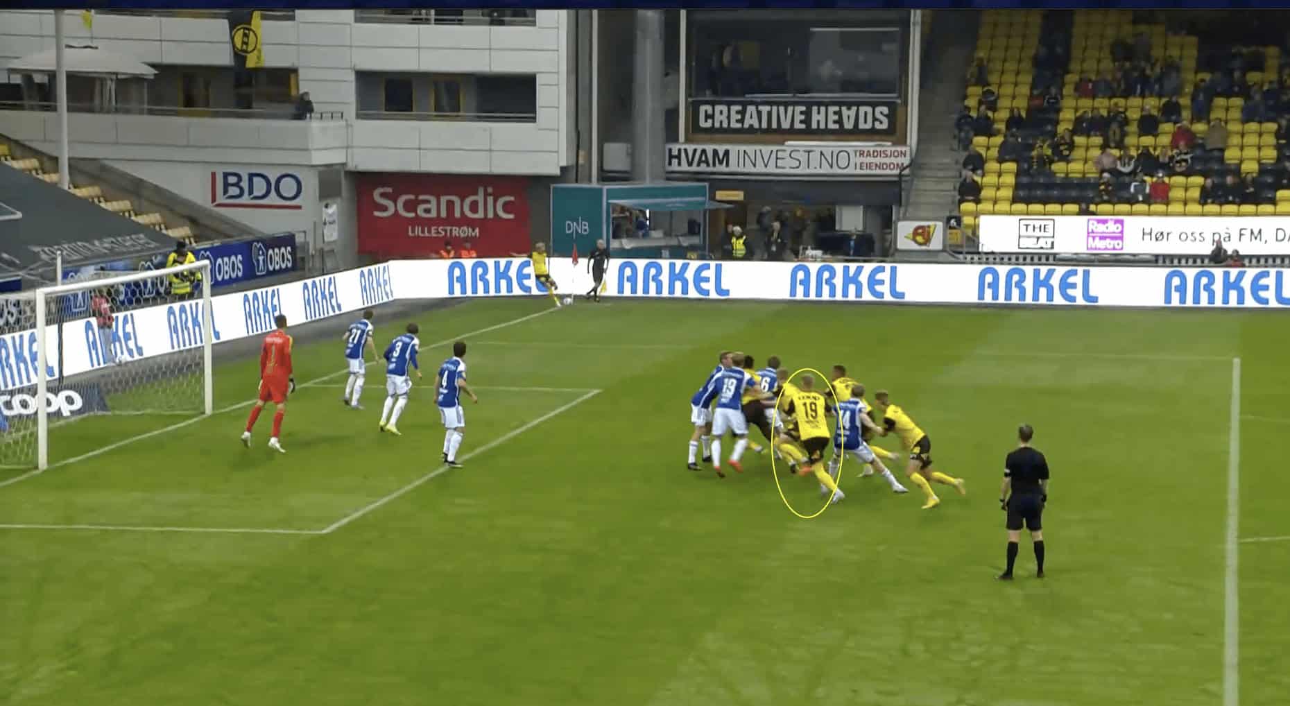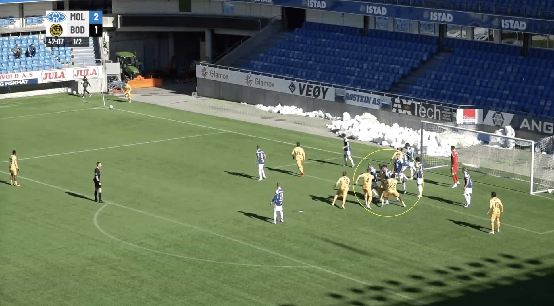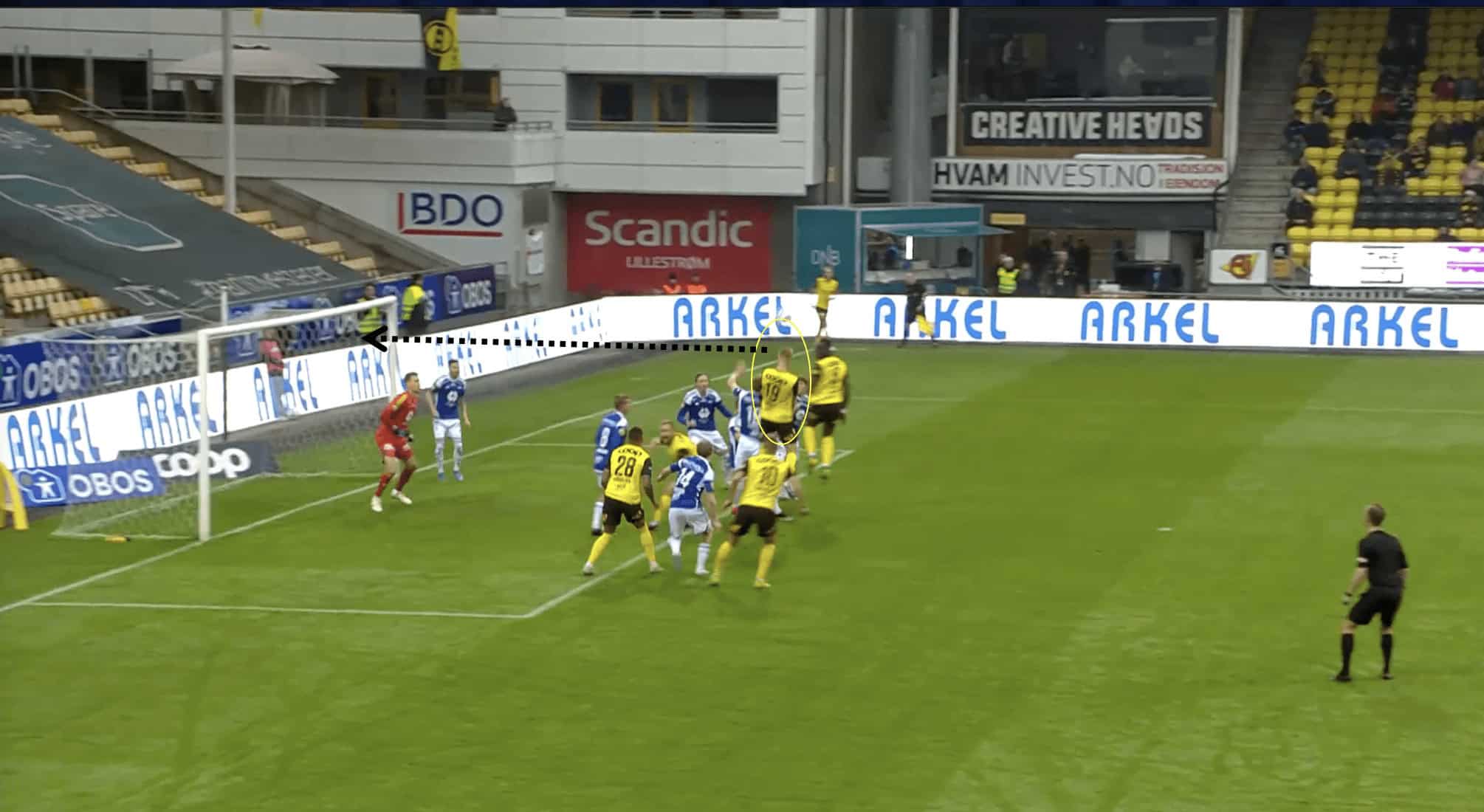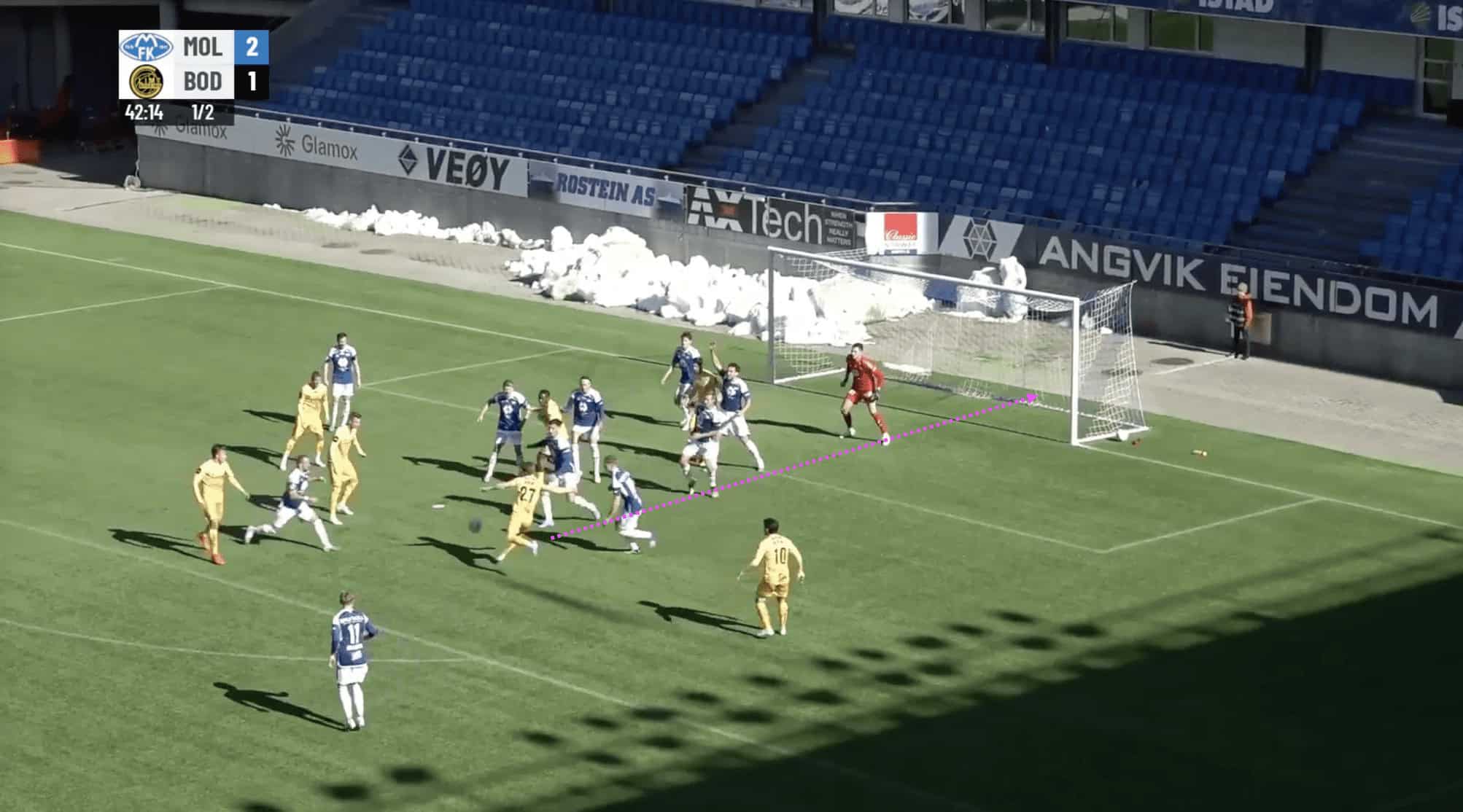 Moving on with the analysis, an area of concern to Erling Moe is likely to be that his team have displayed some questionable defending during set pieces this season. We can see in Figure 3.1 that Kristoffer Tønnessen isn’t being marked by anyone and as a result, has a free header at goal. Molde’s set-up for defending corners usually involves a mix of zonal and man-marking which does appear to occasionally create an element of confusion.