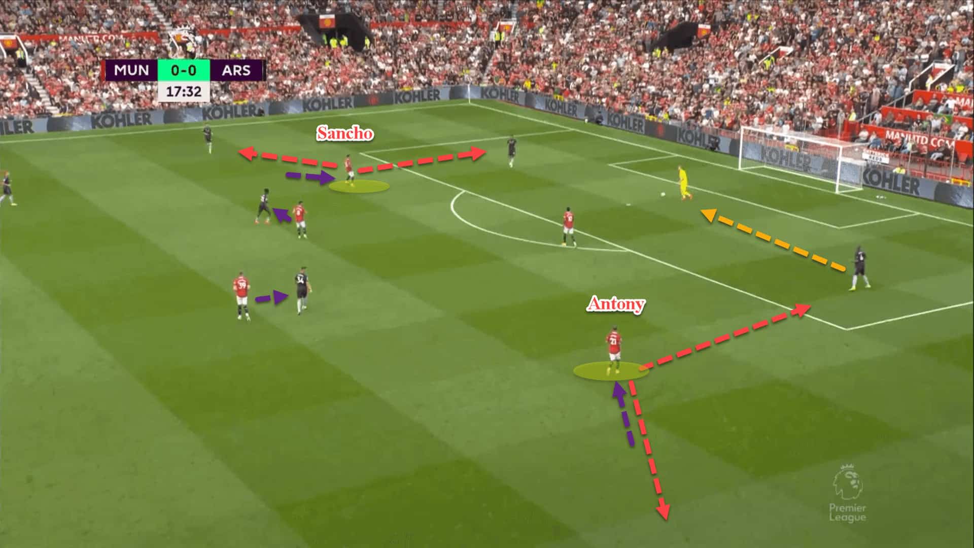 Meanwhile, Antony and Jadon Sancho zonally and situationally pressed the Gunners’ fullbacks and centre-backs.
