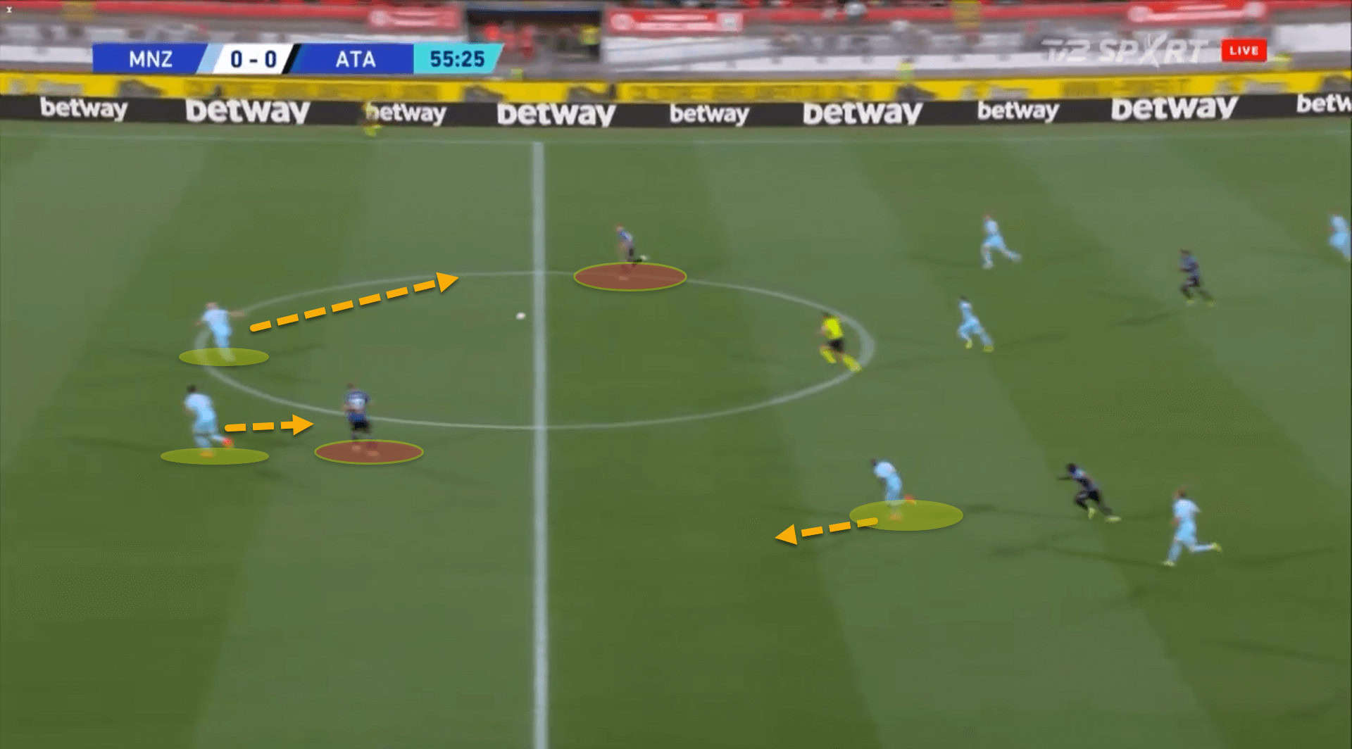 It is clear that Monza have taken their foot off the gas a little this term and are a little more conservative when pressing than last season. The step up in quality from the two tiers is the main reason. Howsoever, opponents are still finding it incredibly easy to play over Monza now as their man-orientated pressing system has not changed.