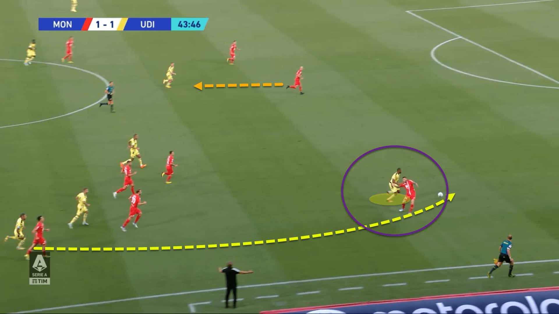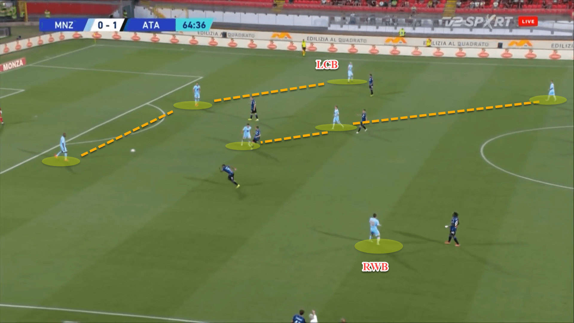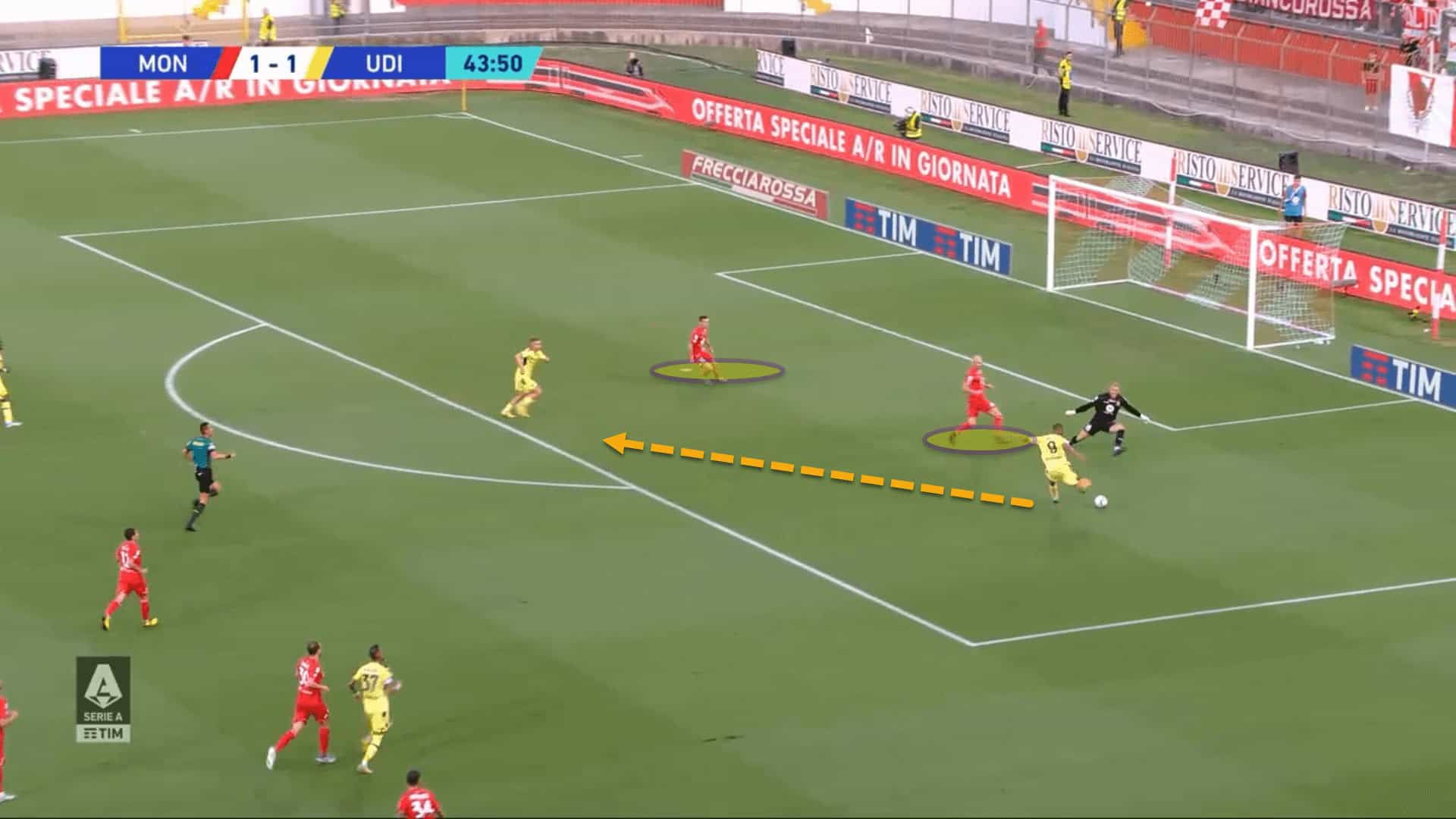 This is the case for both of Monza’s wide centre-backs in the three-man defensive line. If the team’s initial counterpress is broken, they act as the second protective net to try and either curtail or nullify the counterattack.