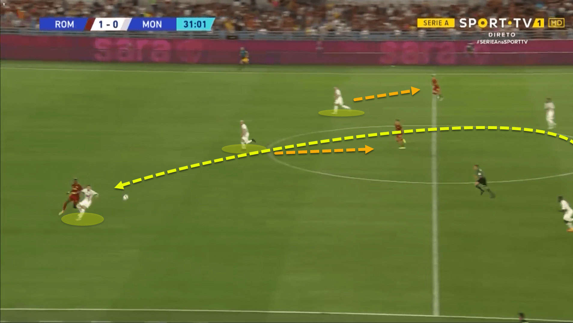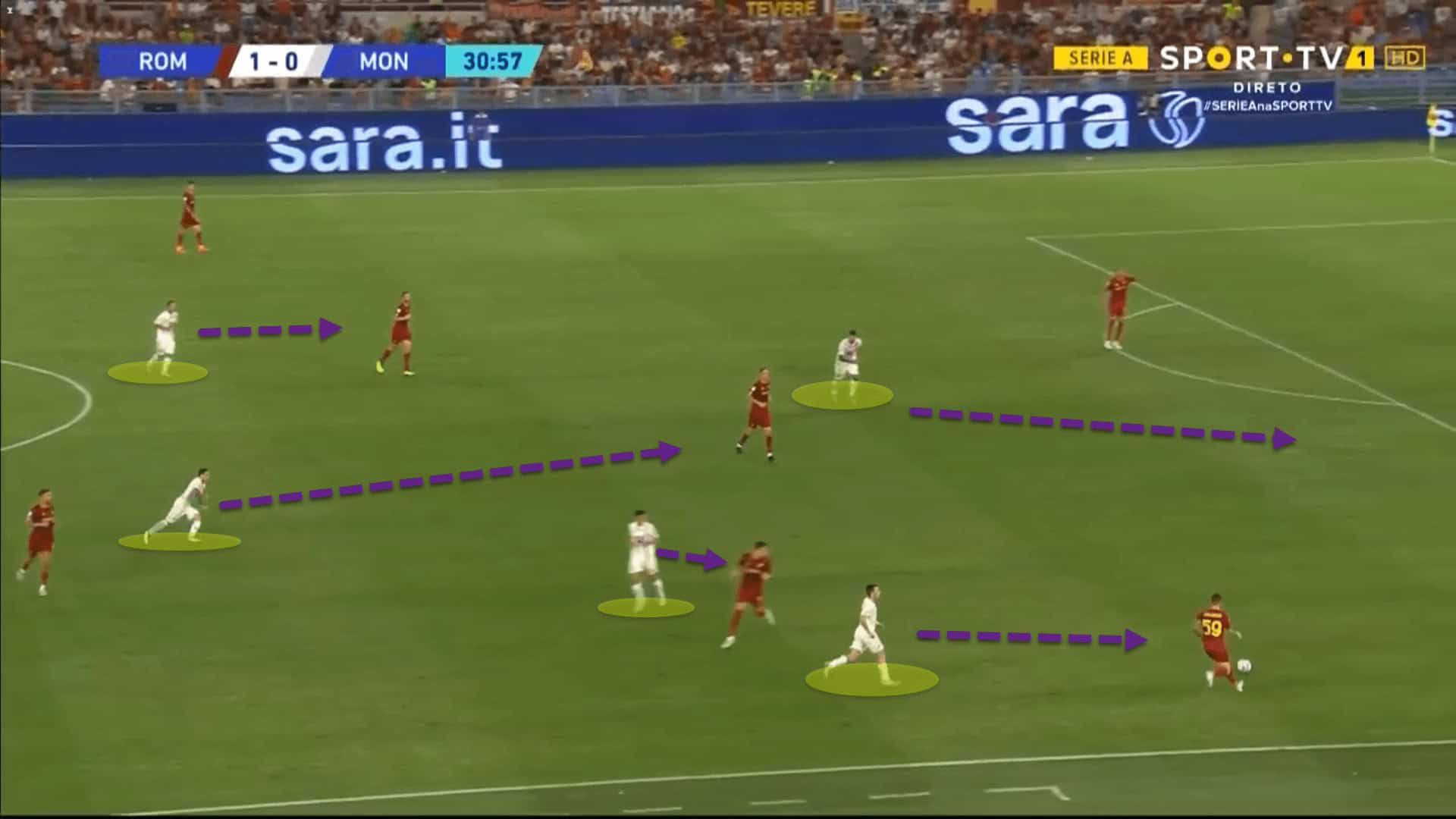 Roma scored twice by taking advantage of this lapse in structure. As highlighted above, the Giallorossi’s wingback has latched onto a lateral pass played to him and simply hit the ball over the top of Monza’s man-marking midfield and forward line.