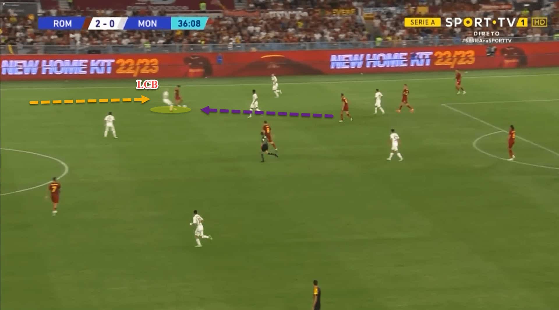 Here, Monza’s first counterpressing attempt against Roma has failed and so left centre-back Luca Caldirola has stepped out towards the attack in order to stop the break from becoming more dangerous.