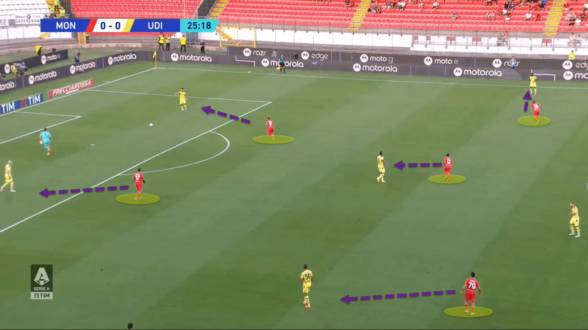 Often, Monza’s centre-backs stand on the ball and wait for the opponent to either jump them through pressing, creating openings in the defensive block, or else for the midfielders ahead of the play to execute their rotations and create a passing angle to receive the ball behind the first line of pressure.
