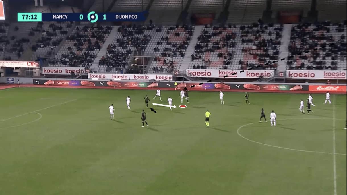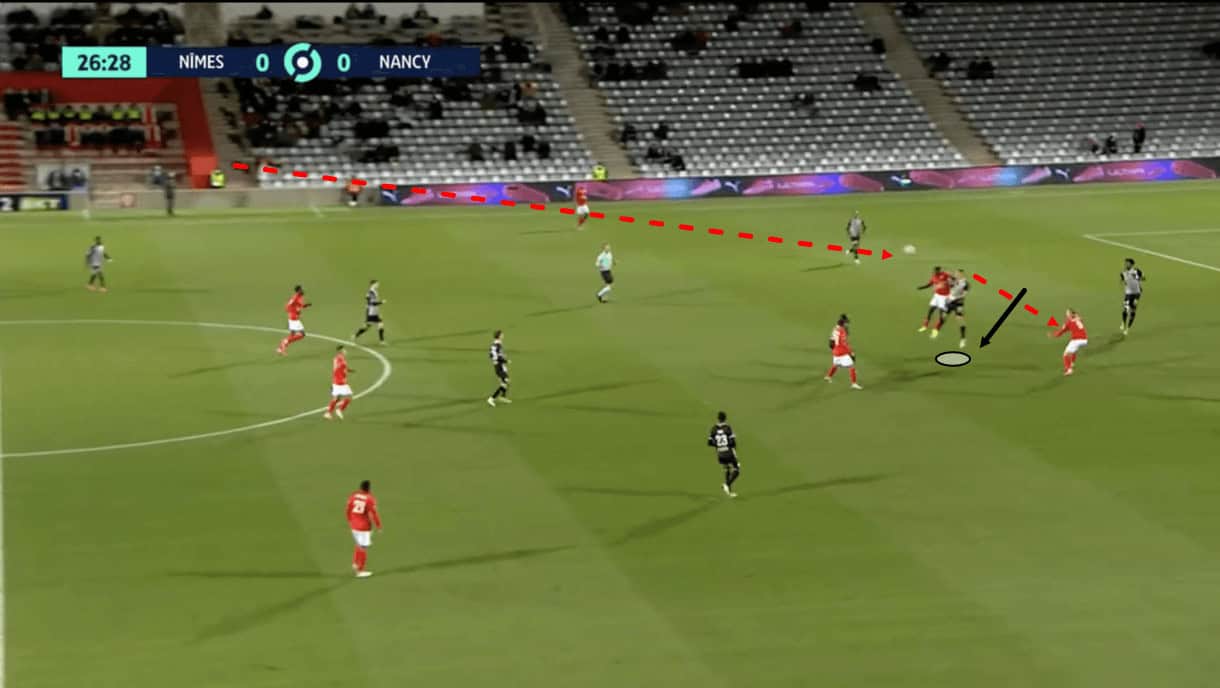 Nancy’s centre-forward could’ve played an important role here by tracking the runner who was closest to him and preventing him from exploiting this space, while he at least could’ve made a better attempt at getting back and defending once the pass was played. However, as figure 4 shows, he didn’t do either and the opposition midfielder had the time and space to create from central midfield, where he picks out a run in behind Nancy’s right-back from his left-winger.