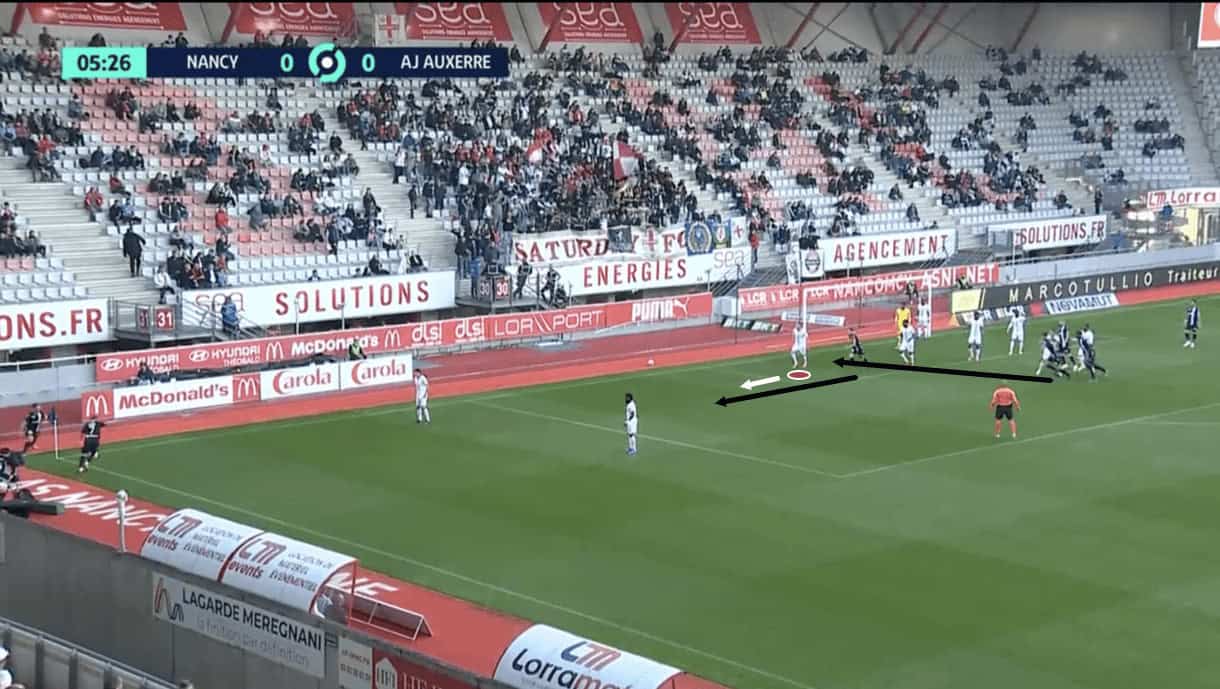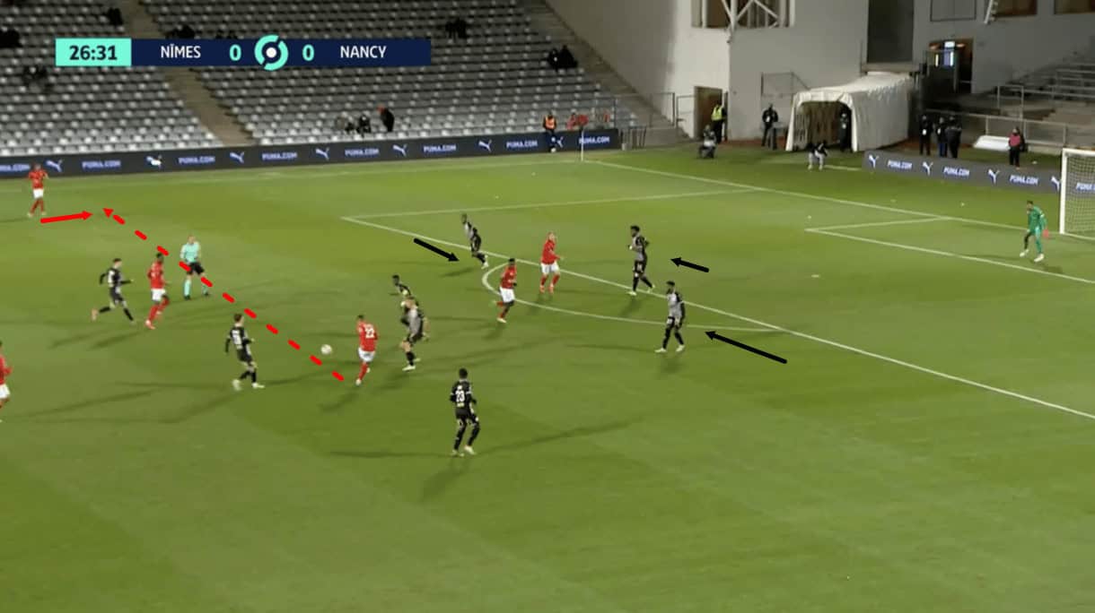 The right-back could also have done better here by scanning to be more aware of this attacker’s run and positioning himself better to block the through ball. However, I think the main issue here is Nancy’s failure to protect the centre well enough once the right central midfielder’s positioning was manipulated. For me, the centre-forward has to offer more in terms of tracking back in this instance, while the right-winger also needs to be coming across more to protect the space between him and the right central midfielder.