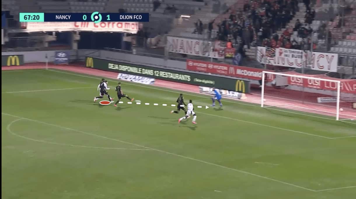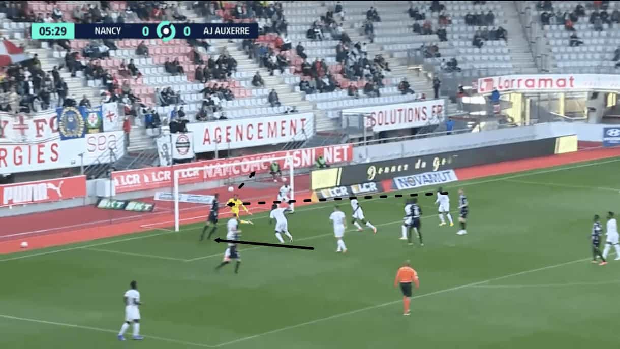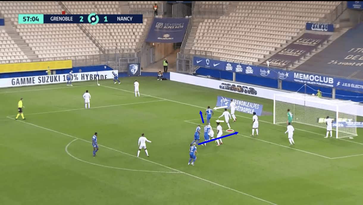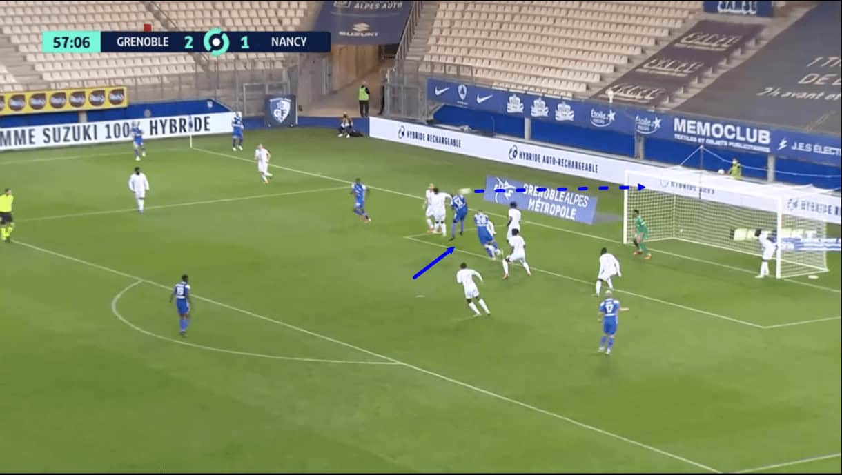 Again, this creates space for one of the runners from deep to attack and as he breaks past the defender guarding him initially, we see that he actually ends up behind the Nancy defenders marking the front post and the front of the six-yard box, from where he can take a free headed shot at goal, that results in a goal for Grenoble.