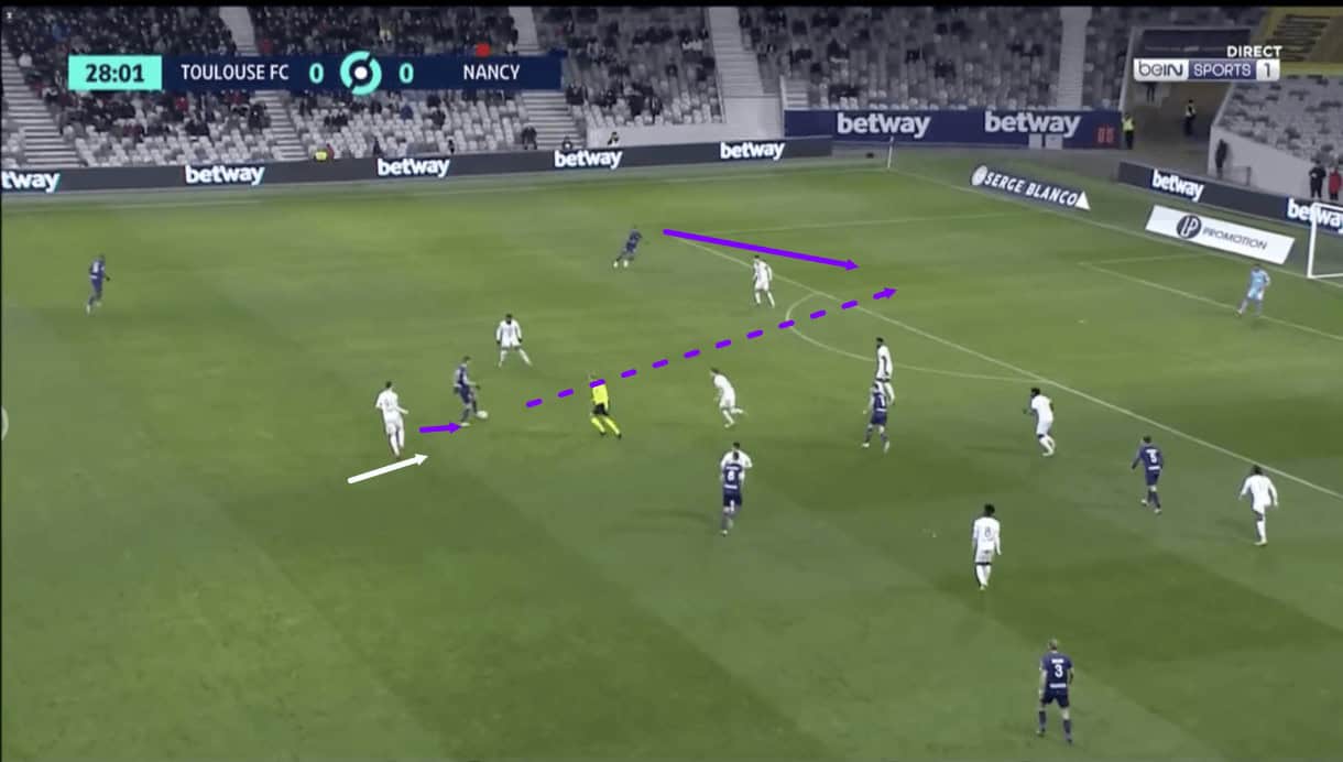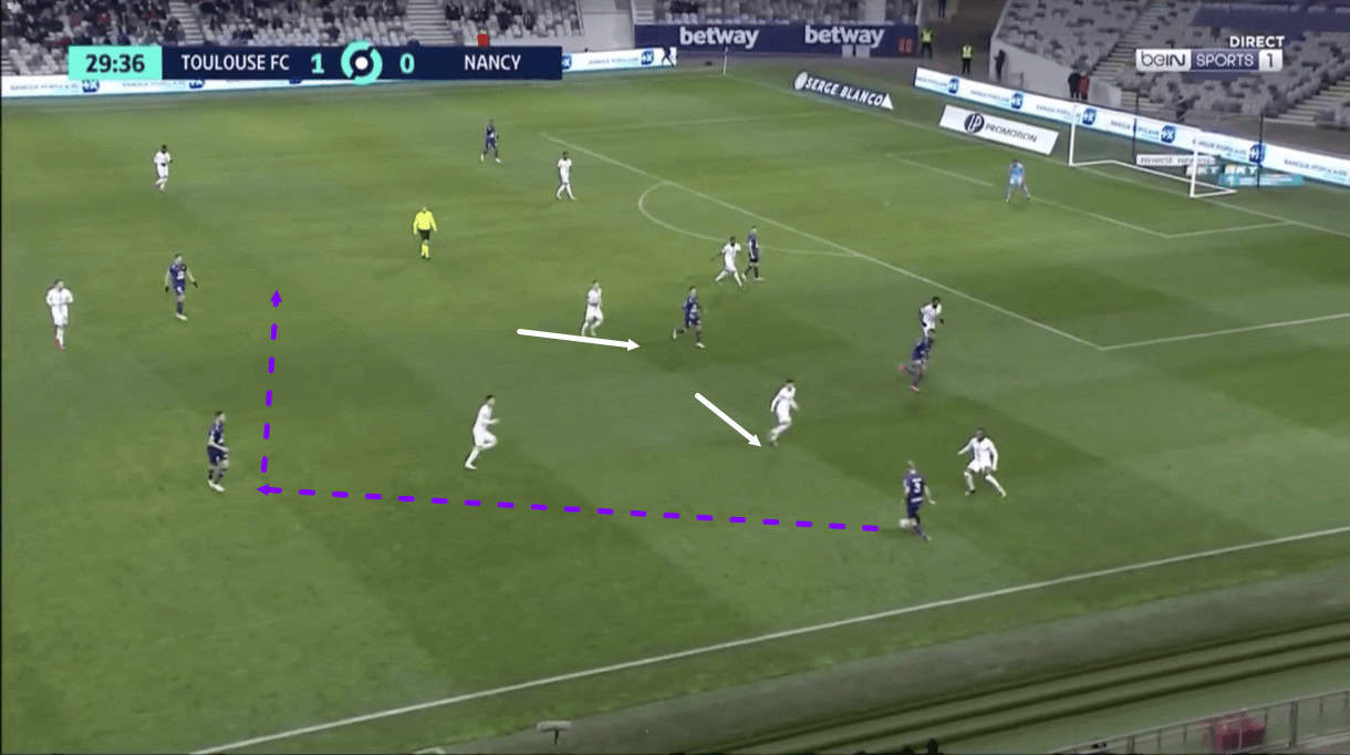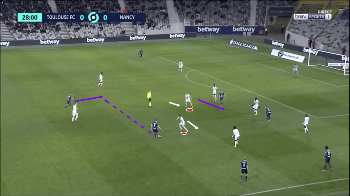 Just before figure 3, the opposition’s left central midfielder ran to the right, dragging Nancy’s right central midfielder with him, as is marked on the image above. This bit of manipulation from Toulouse’s midfield runner, and the failure of Nancy’s right-winger to come across and protect the central space, created an opening for the team to effectively exploit the newly-found space in midfield, which is exactly what happens. As play moves on, we see Toulouse’s right central midfielder on the ball here play the ball into his teammate exploiting the space vacated by Nancy’s right central midfielder.