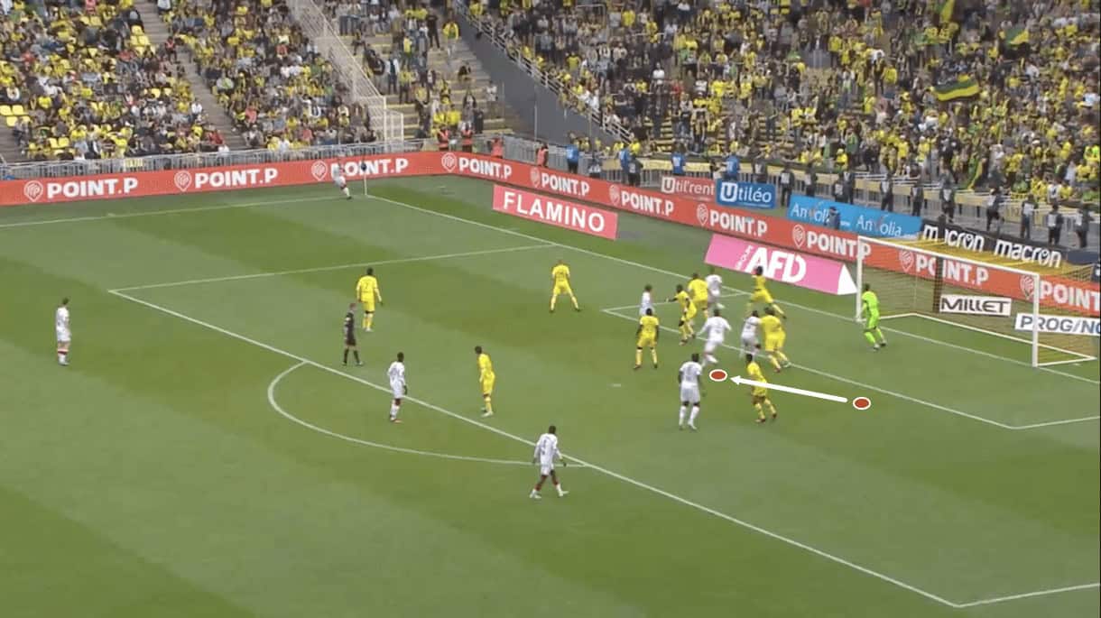 Flips put the ball away from here with a clear shot at goal presented to him by Nantes’ poor defending from two consecutive crosses.