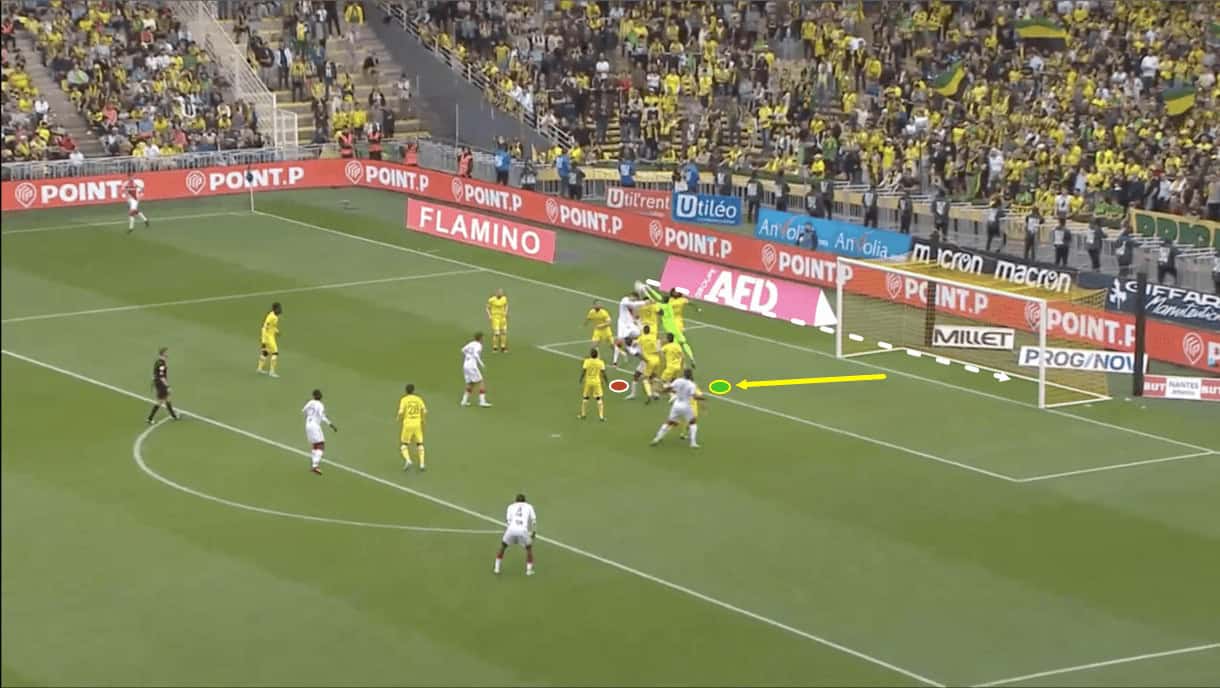Let’s get into the nitty gritty of Nantes’ defensive weaknesses, then. During this rough patch, the major thing that’s stood out as an area of weakness at the back for Les Canaris has been their ability to deal with crosses — including those coming from set-pieces.