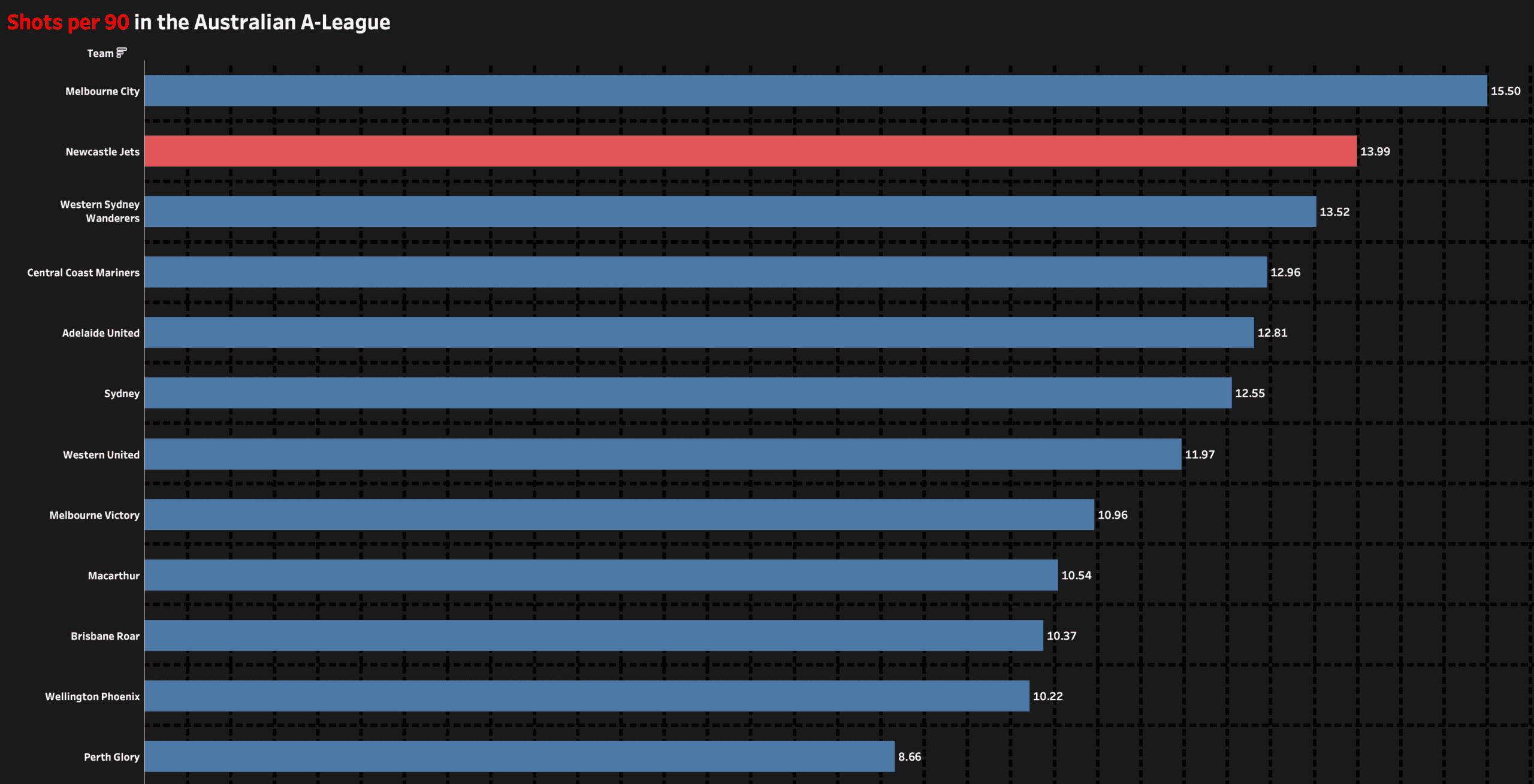 As you can see from this data visualisation Newcastle are comfortably the team who average the most passes per 90 in the Australian A-League.