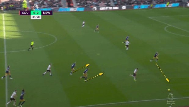 Although the two Newcastle defenders going into the box will be left exposed in a two versus two situation, the two players running towards the box reach in time so that there are once again four defenders in the back line, which makes it much harder for the Saints to have a target in the box to cross the ball to.