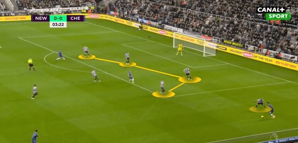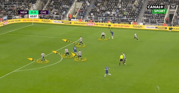 Even though there is only one Chelsea player going into the box, the Newcastle players go into the box to create a back four, rather than one more player pressing the ball carrier to try and regain possession.