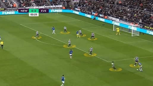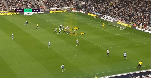 This is done with the confidence that one of the midfielders or wingers will come back to help in defence, and that is exactly what happens. Midfielder Joelinton has been a crucial player for Howe’s side this season. We can see in the picture below that while the back four is in the box, Joelinton drops deep to press the ball carrier.