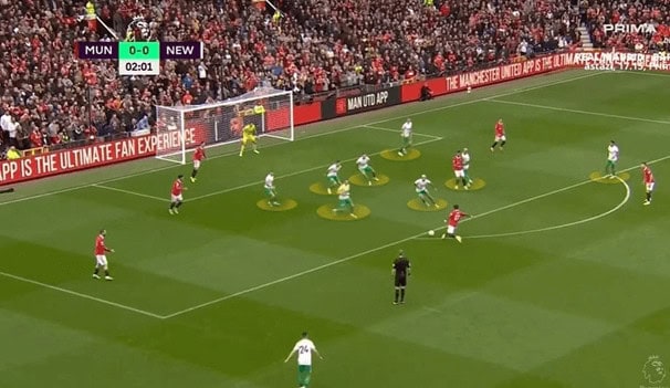 With such changes in formation, Newcastle often have forwards playing in midfield and even coming back in defence as we have seen above. It seems that Howe has instilled a sense of tenacity in the squad. From the picture below, we can see that even just two minutes into the game, there are eight Newcastle players defending.