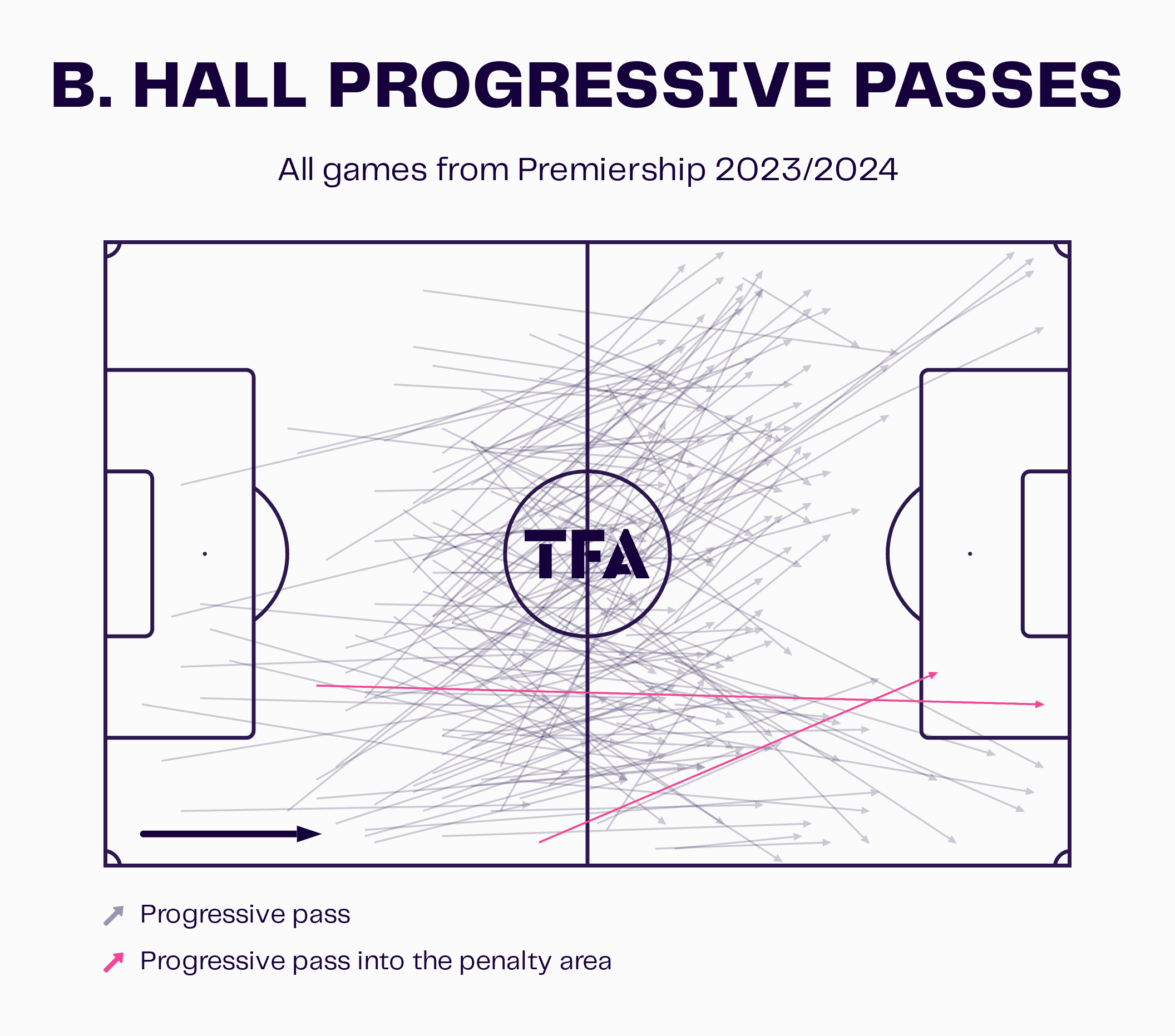 Furthermore, if we look specifically at Ben Hall’s progressive passes this season, we can see how instrumental the 27-year-old is at playing long progressive passes in wide areas.
