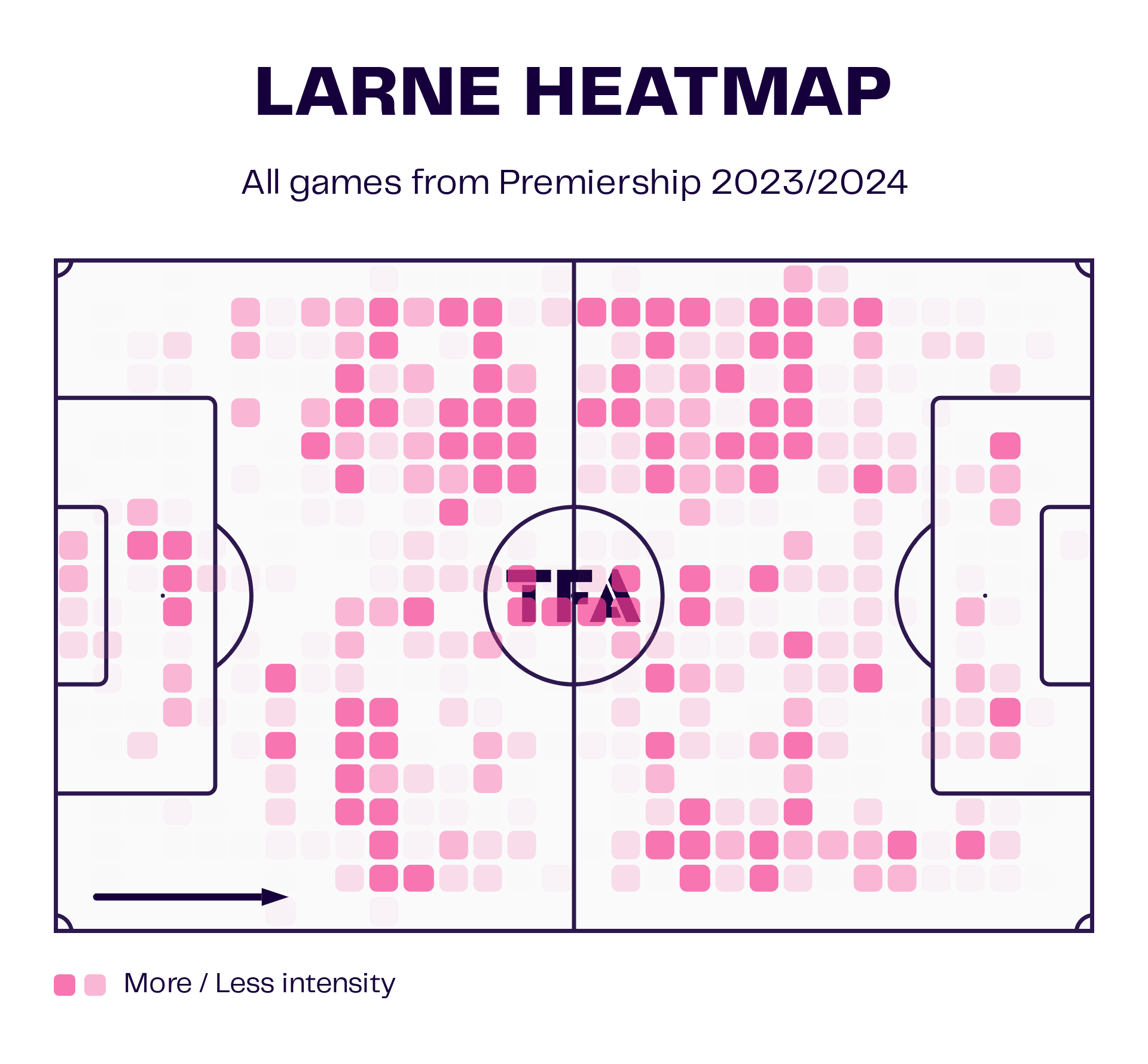 This heatmap shows where on the pitch Larne is most active.