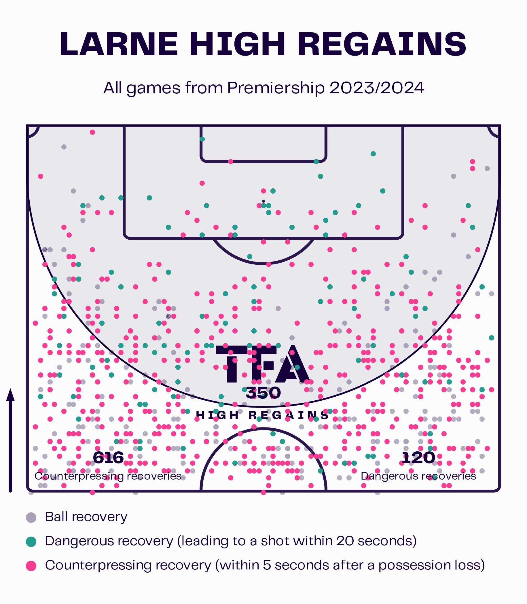 The data visualisation shows that Larne has completed 350 high regains this season and 616 counter-pressing recoveries.