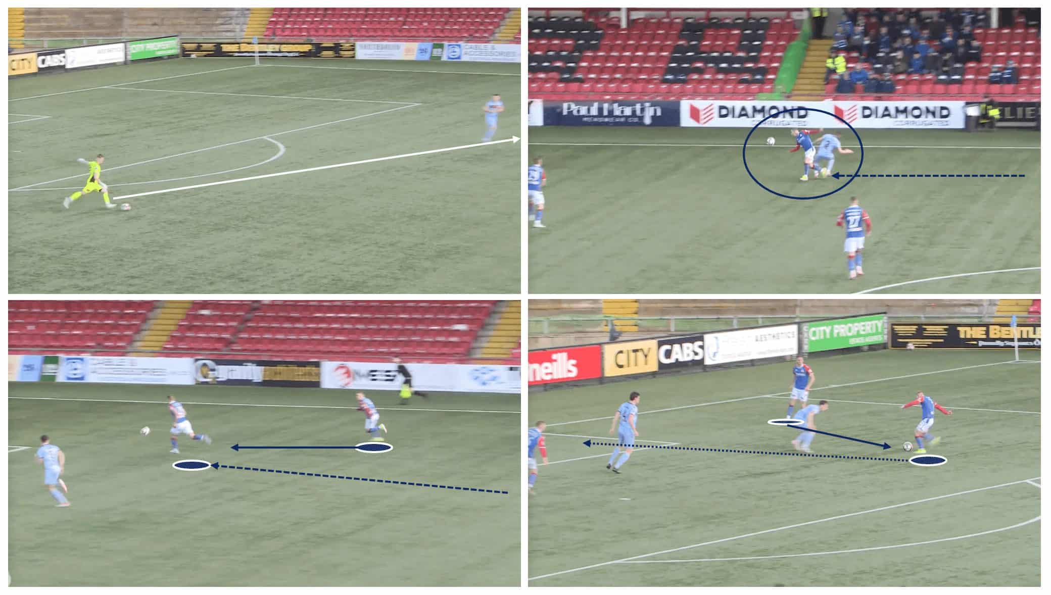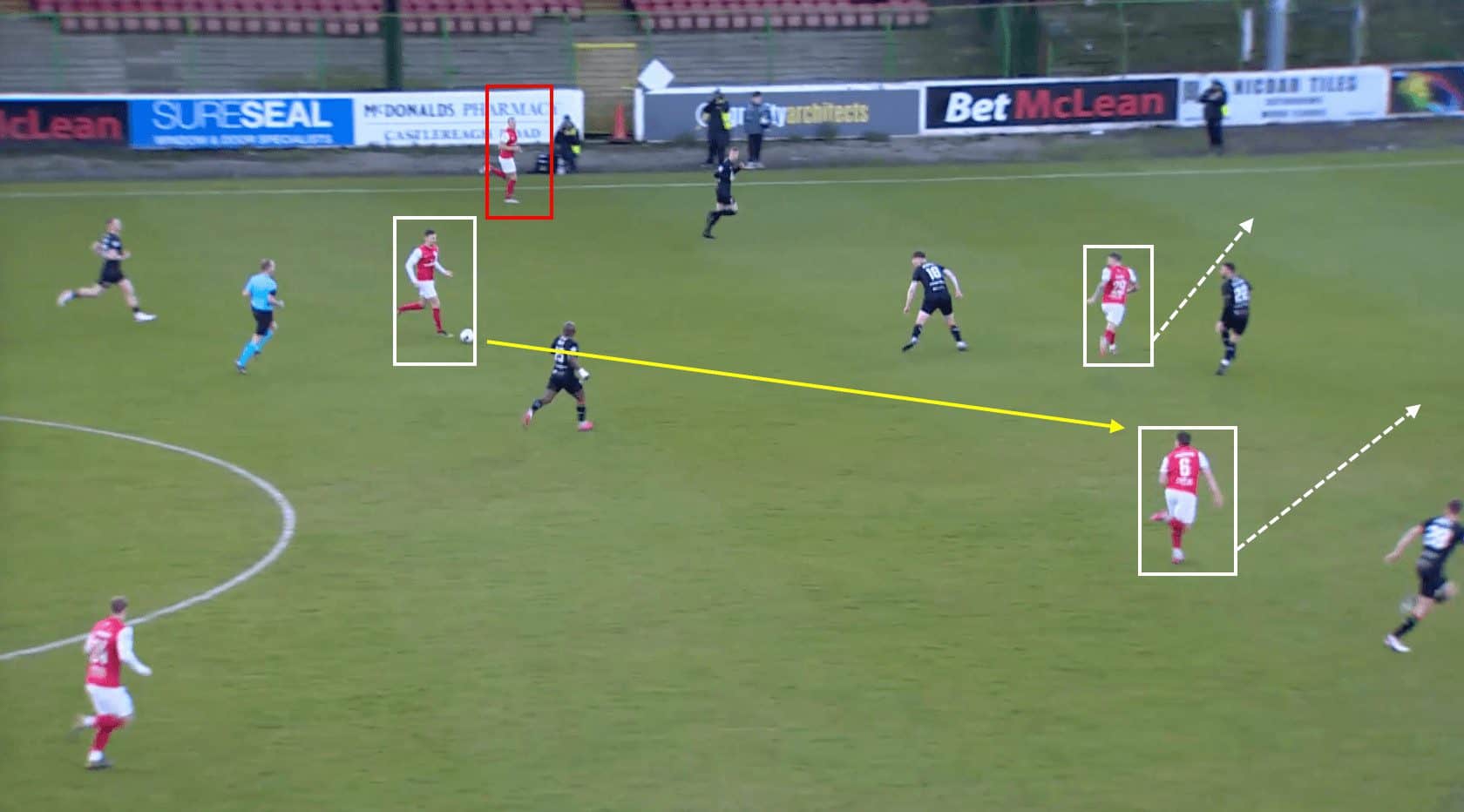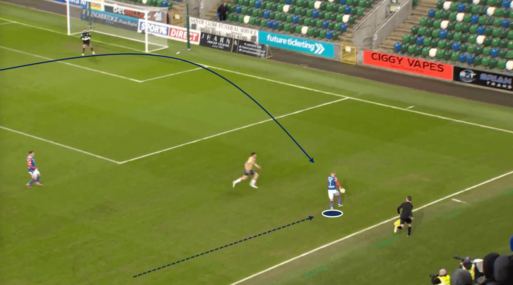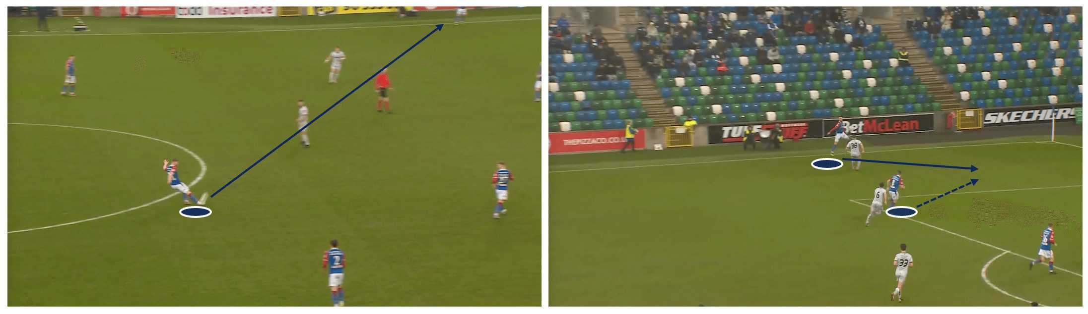 By rapidly transferring the ball from one flank to the other, Linfield aims to disorient the opposition’s defensive structure and create opportunities for their attacking players to receive the ball in space, with time to put crosses into the box, run at the defence, or create goalscoring opportunities.