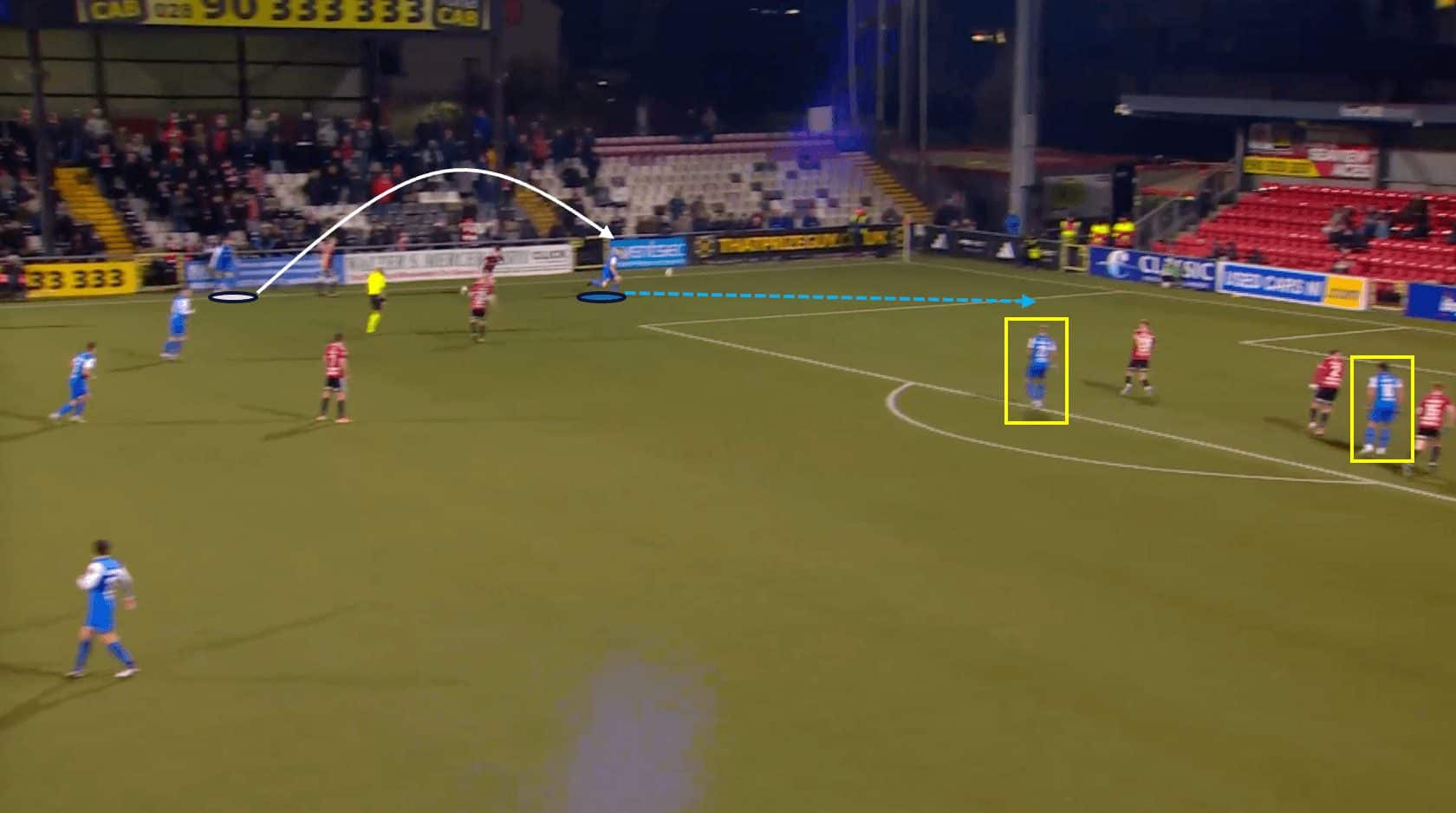 With the full-back focused on Larne’s wing-back, Andrew Ryan (#29) makes a darting run into the left channel, which drags the opposition central defender with him.