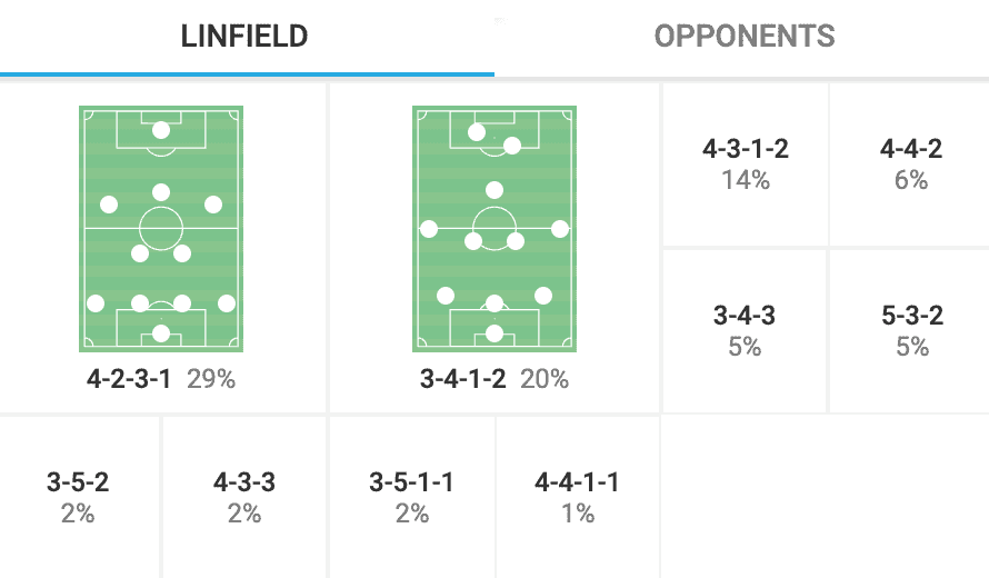 This graphic shows that the most used formation for Linfield has been the 4-2-3-1, closely followed by a 3-4-1-2 system.