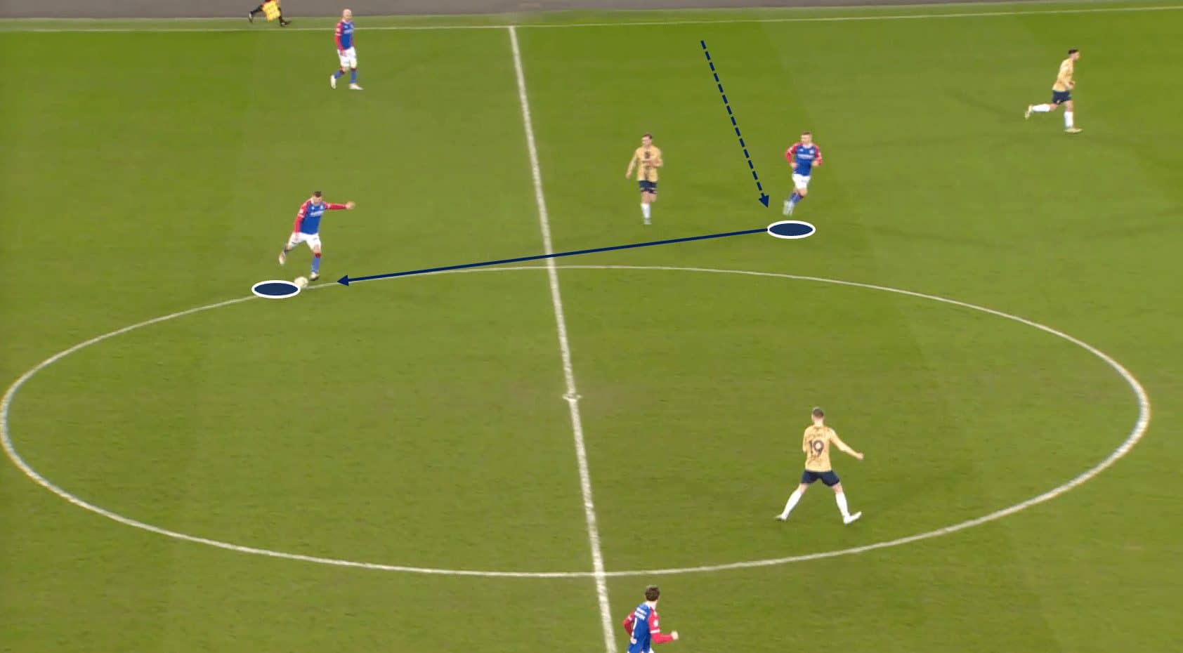 In this example, Andrew Ryan (white circle) has drifted out to the left flank to link up with Levi Ives (blue circle).