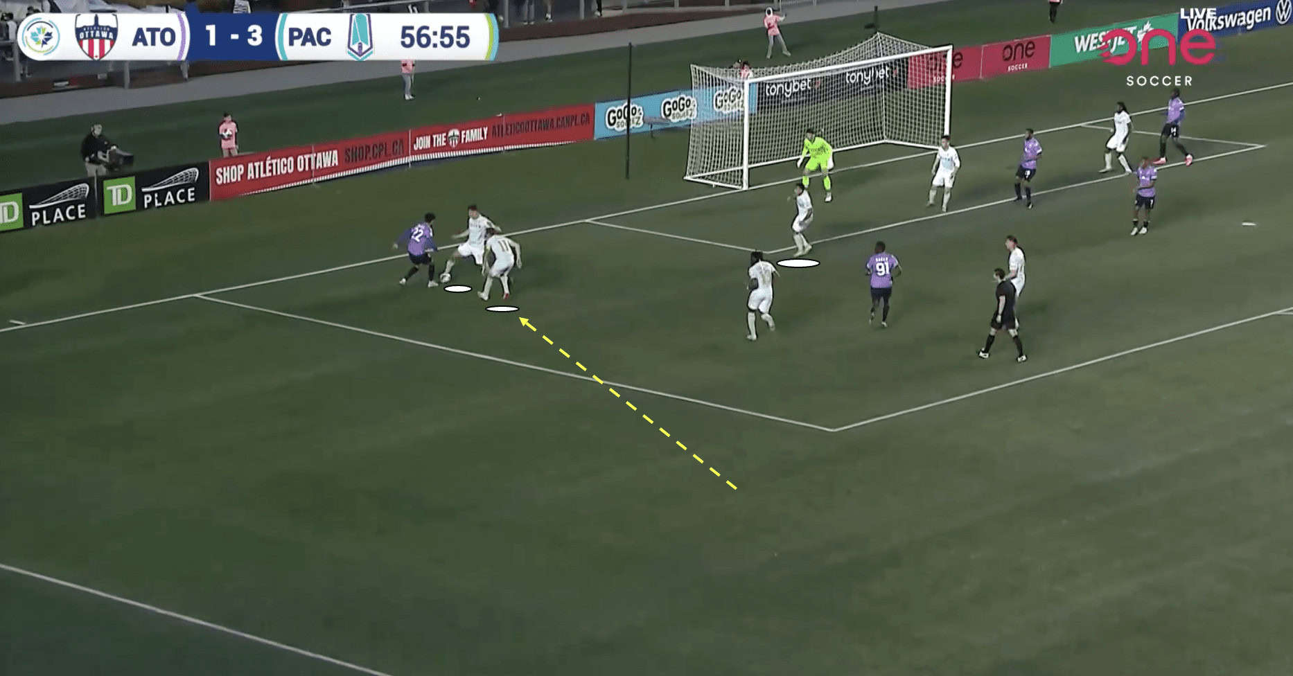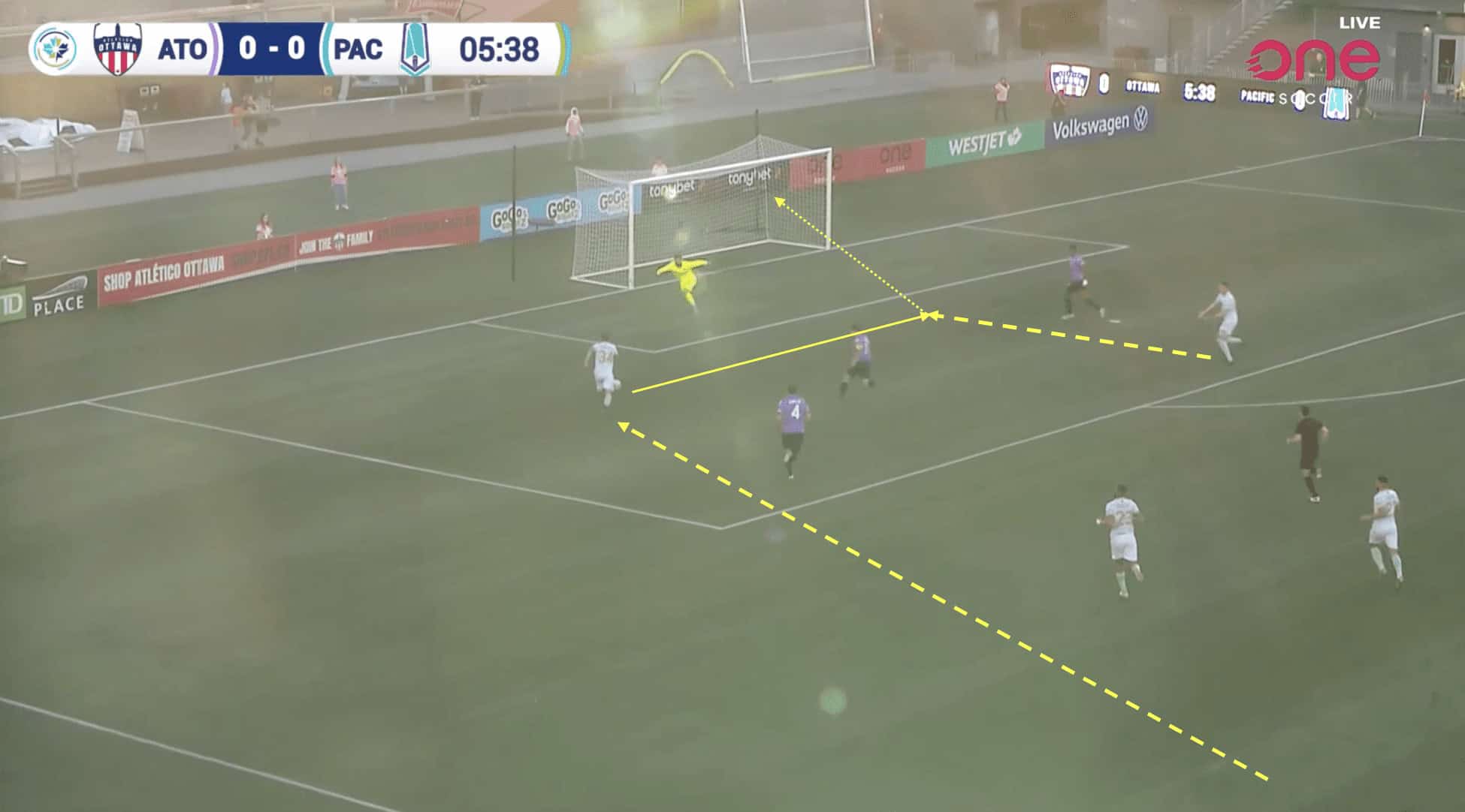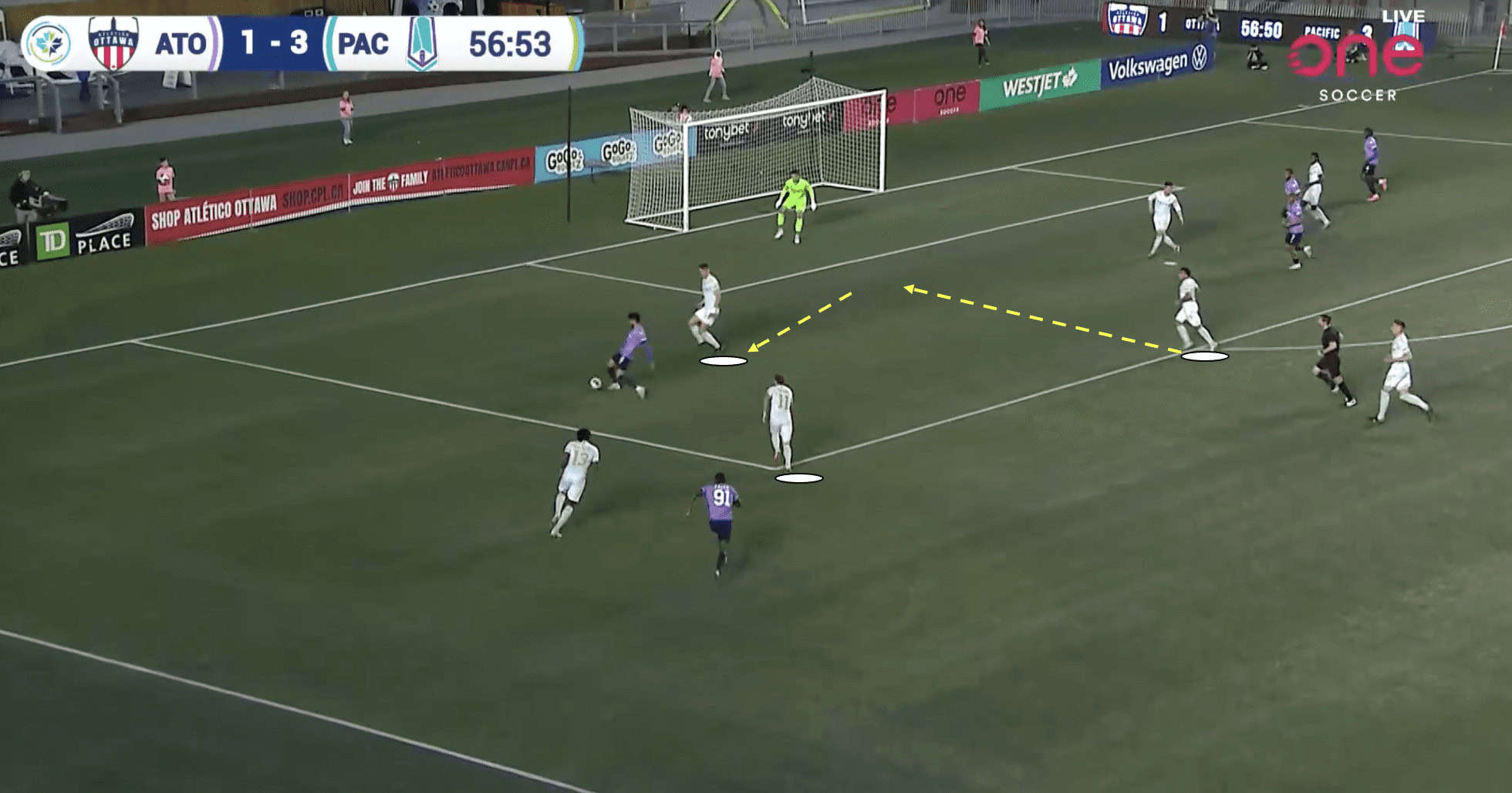Merriman’s team will only look to press when they believe a goal-scoring opportunity can be created. In Figure 1.1, we can see that Manny Aparicio and former PSV youth player, Djenairo Daniels want to prevent Atlético Ottawa from playing out and have initiated a press. Pacific FC regains possession and very quickly counterattacks.