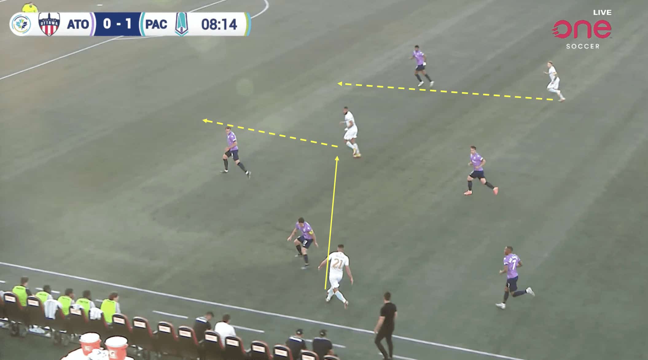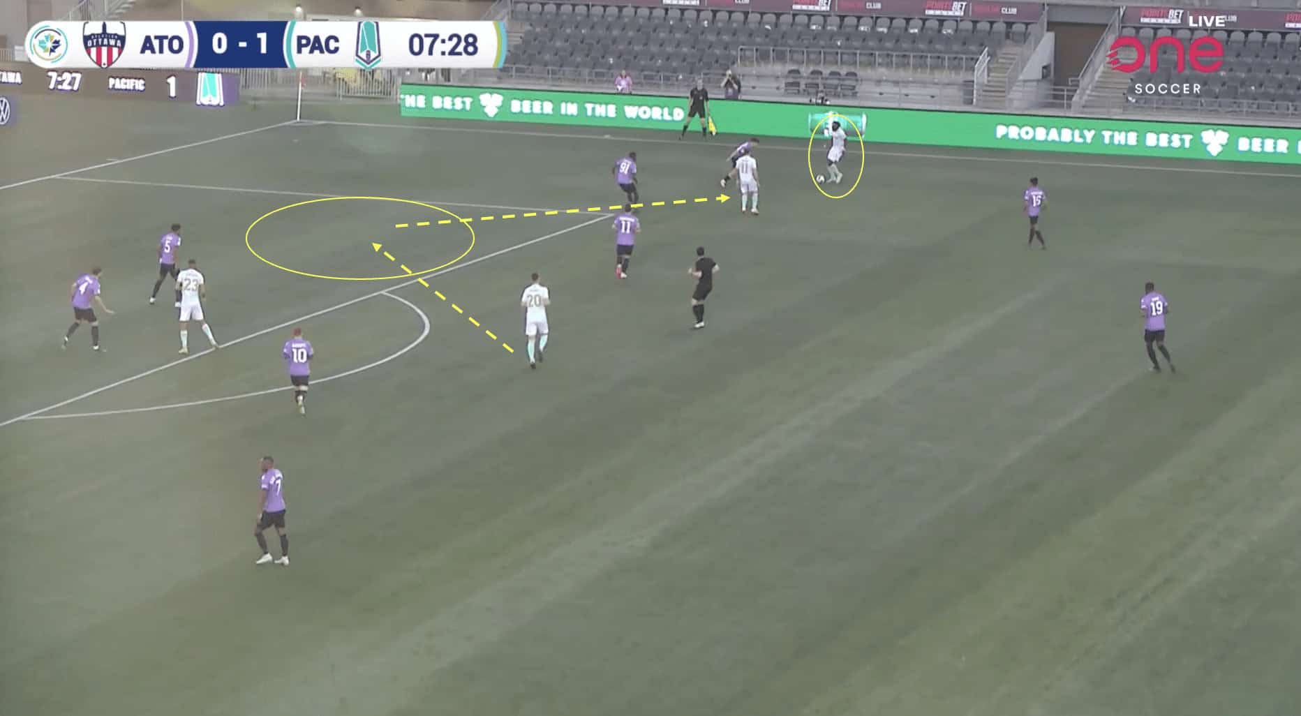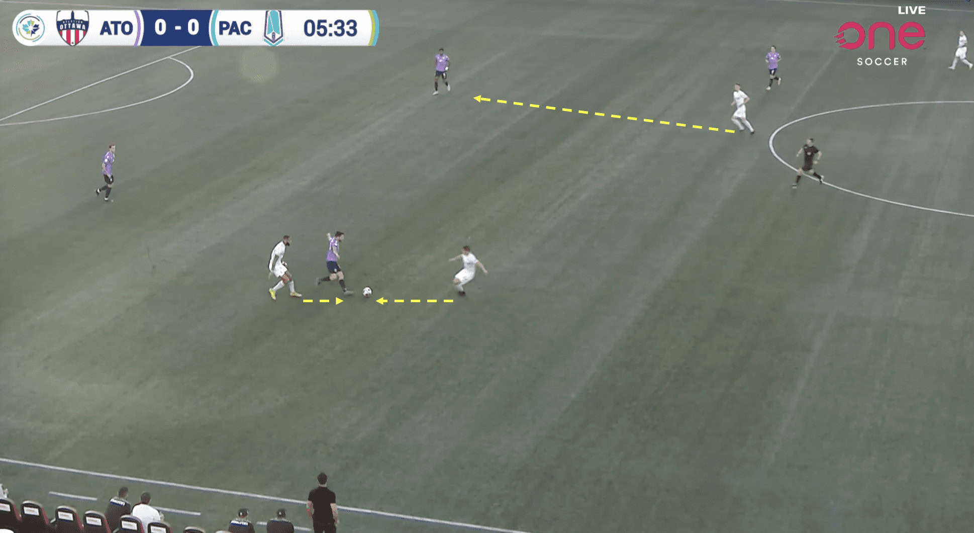 Merriman’s team will only look to press when they believe a goal-scoring opportunity can be created. In Figure 1.1, we can see that Manny Aparicio and former PSV youth player, Djenairo Daniels want to prevent Atlético Ottawa from playing out and have initiated a press. Pacific FC regains possession and very quickly counterattacks.