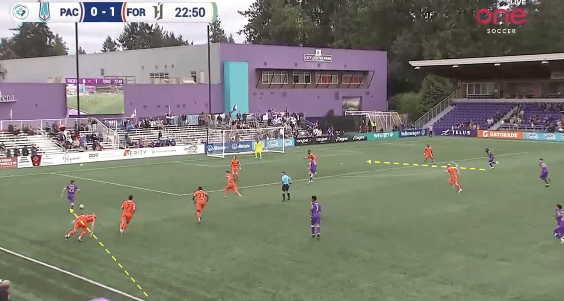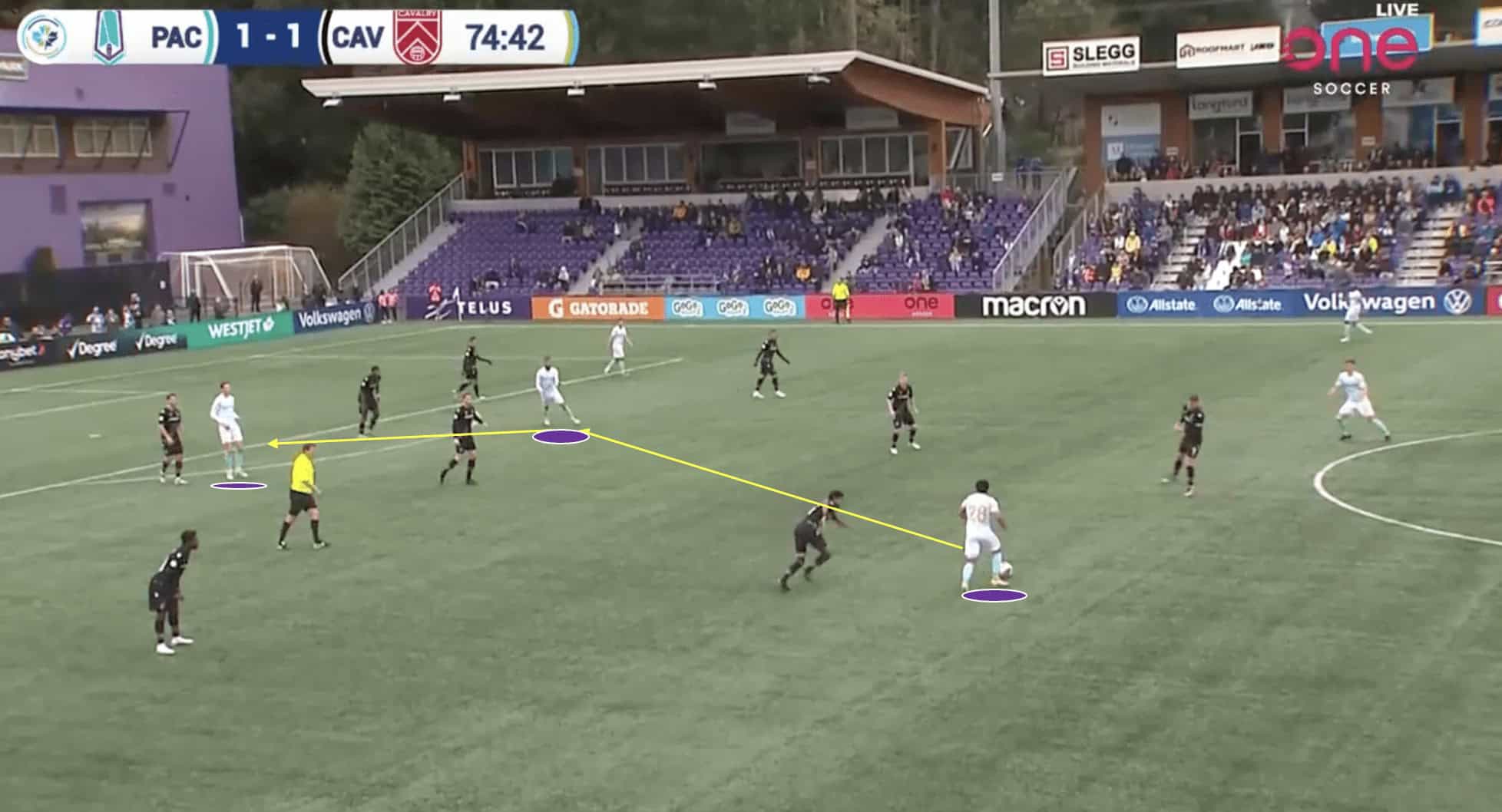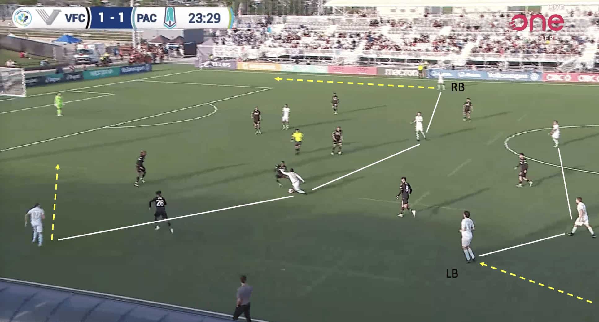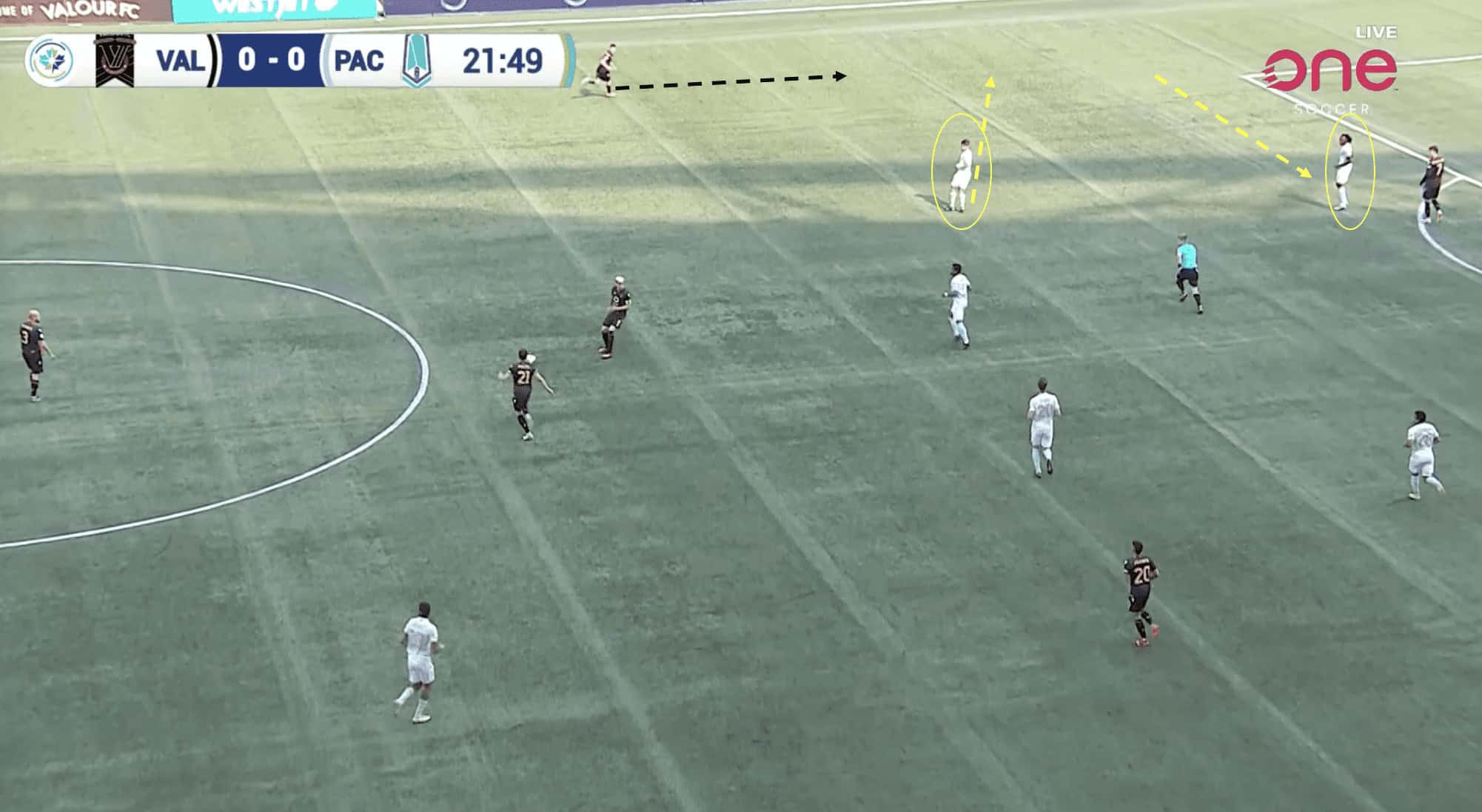 Moreover, this also plays a pivotal role in facilitating quick combination play. By passing the ball to better-placed teammates, Pacific FC are able to execute one-touch passes, quick give-and-goes, and intricate link-up play. This fast and precise passing can very often destabilise the opposition’s defence and create opportunities for scoring goals as we will discuss.
