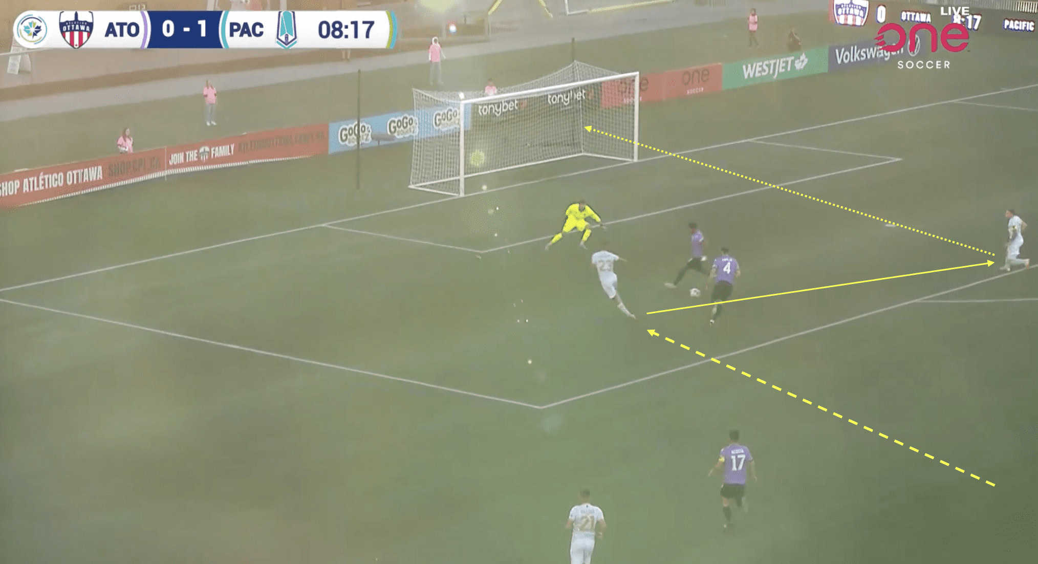 As mentioned previously in this scout report, Pacific FC look to use the wide areas, not necessarily to put crosses into the box as they only have a 34% accuracy rating per 90 this season. Instead, they like to draw the opposition out to the wide areas which leaves spaces for midfield runners into the penalty area.