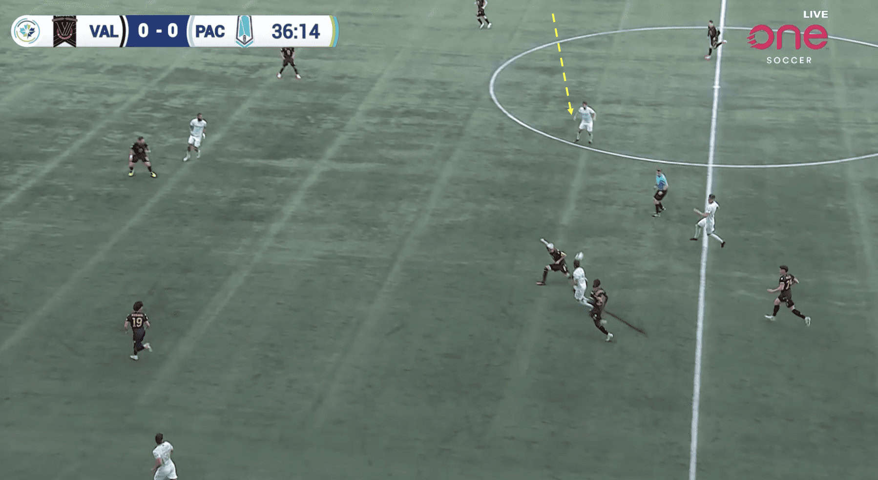 Here in Figure 2.4, we can see Pacific building up through the central areas using intricate passing and off-the-ball movements. Toussaint is in possession and plays an accurate ball into the striker Djenairo Daniels’ feet, he then executes a nice pass around the corner into Young who has moved much further up the pitch from his midfield role. When Pacific exhibits such a wide range of attacking options, it becomes challenging for the opposition to solely focus on shutting down one particular player or shutting down specific areas of the pitch. This is what creates space and opportunities for other players, such as Sean Young, to shine and contribute to the team’s attacking play.