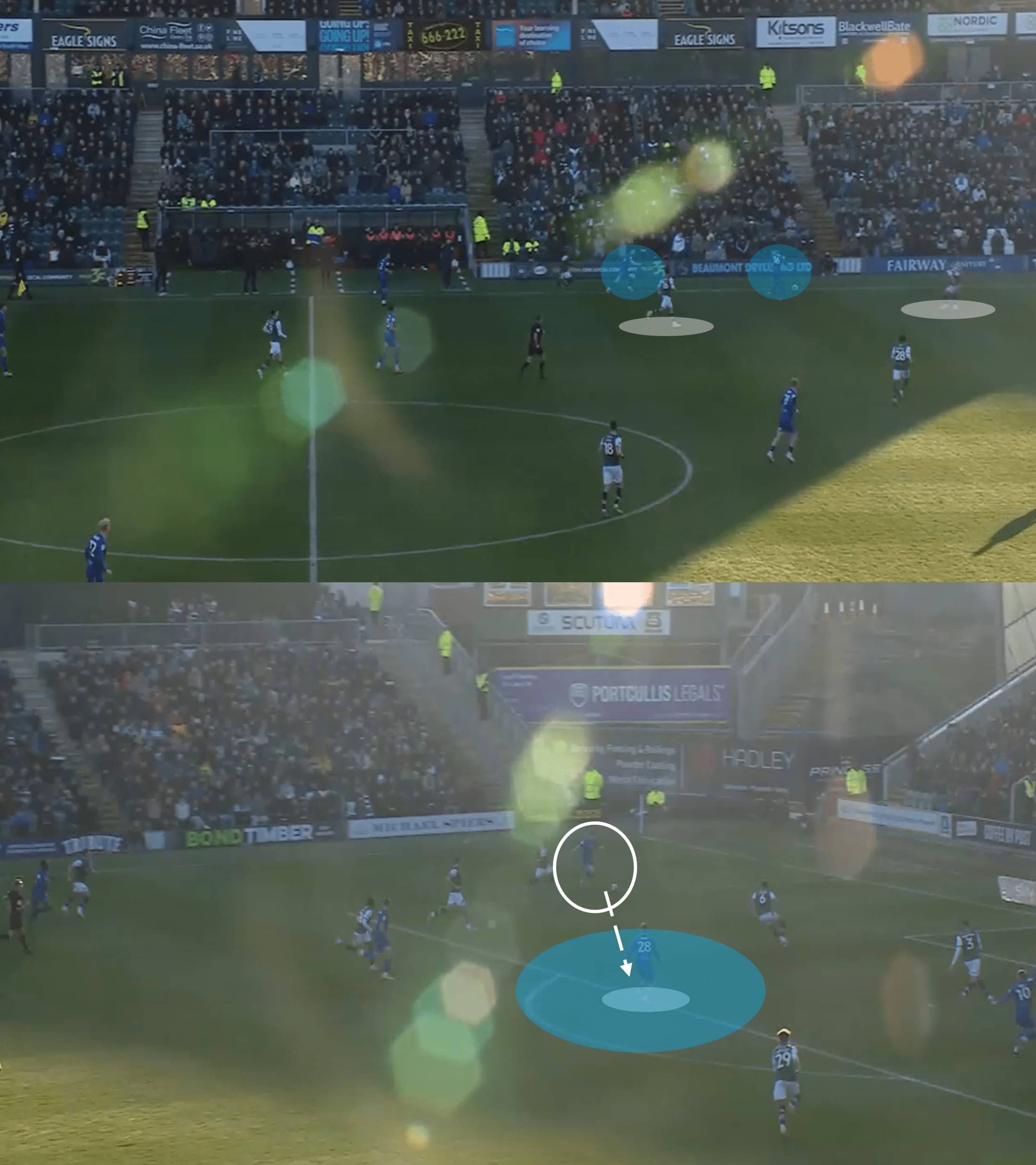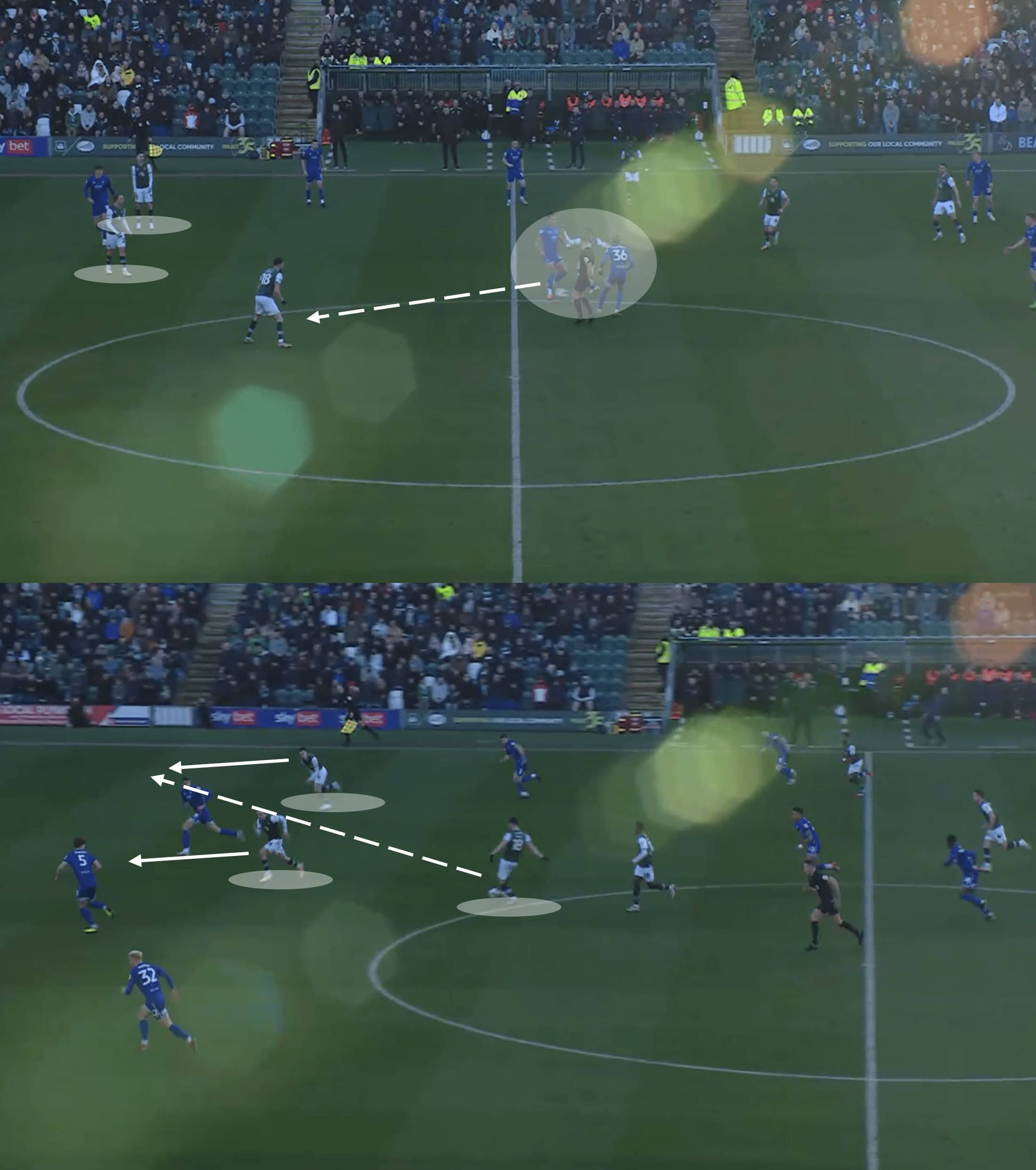 Like the last move, this one starts with the midfielder needing to win his physical battle to get the ball forward—something Argyle is very good at.