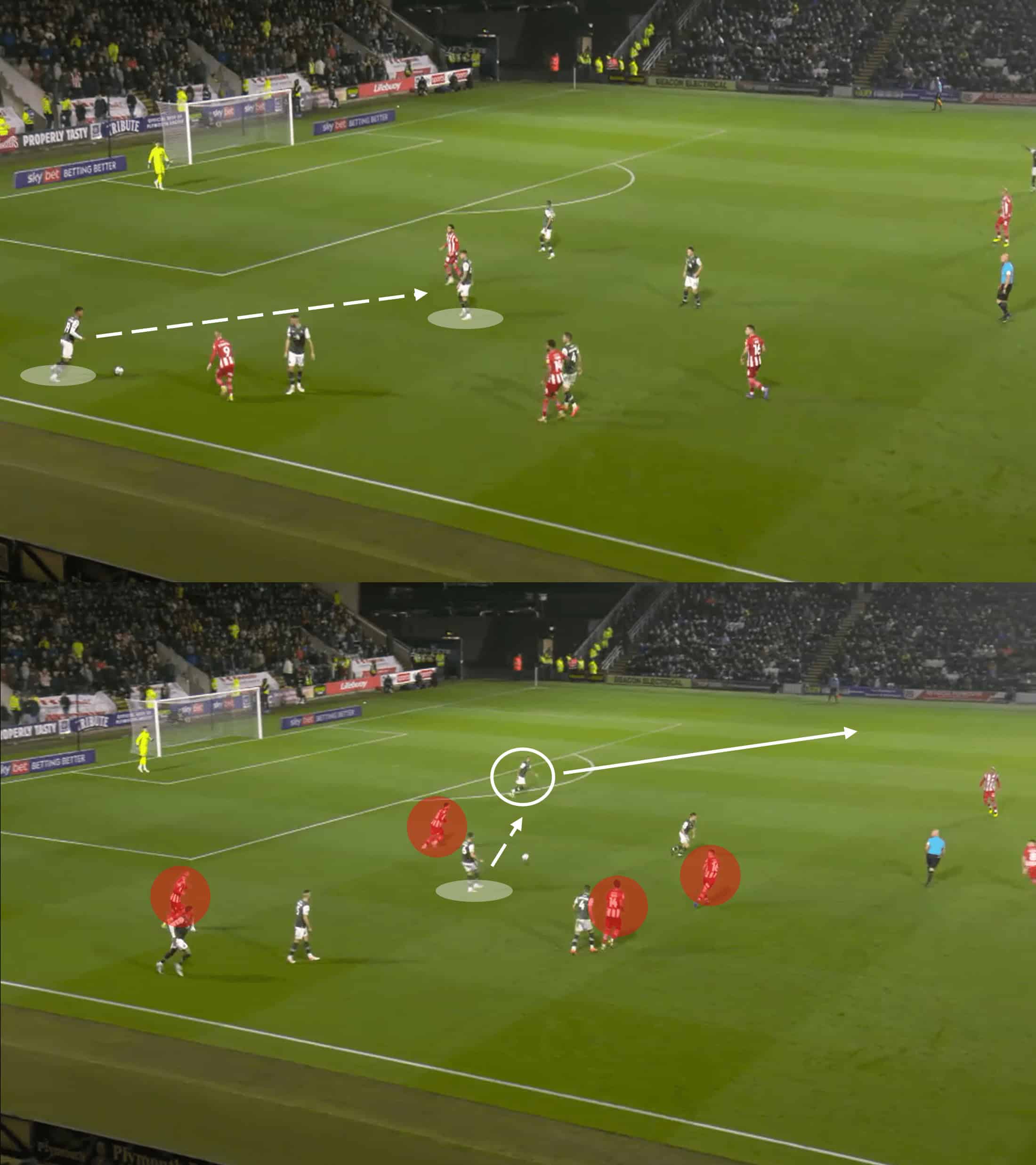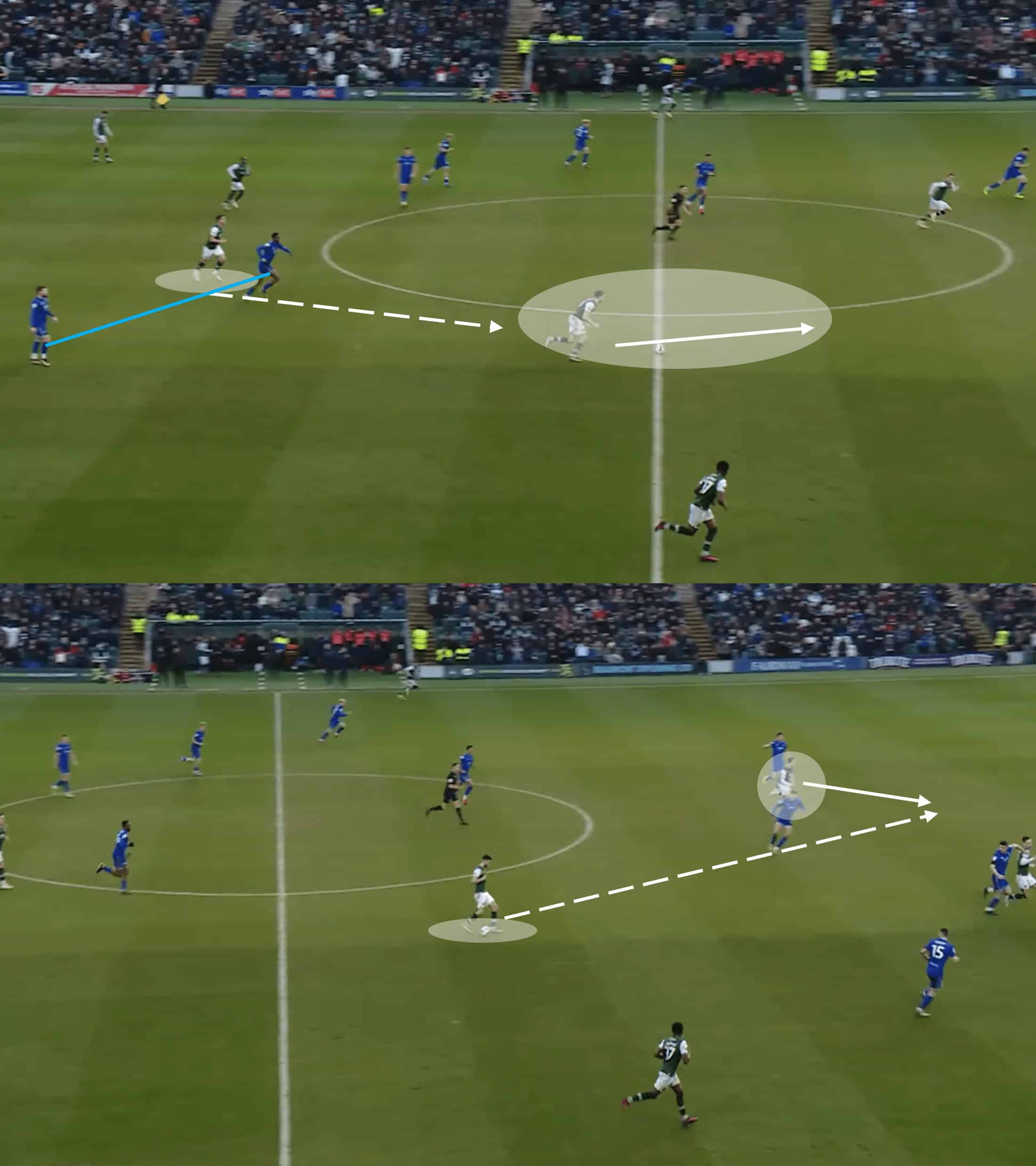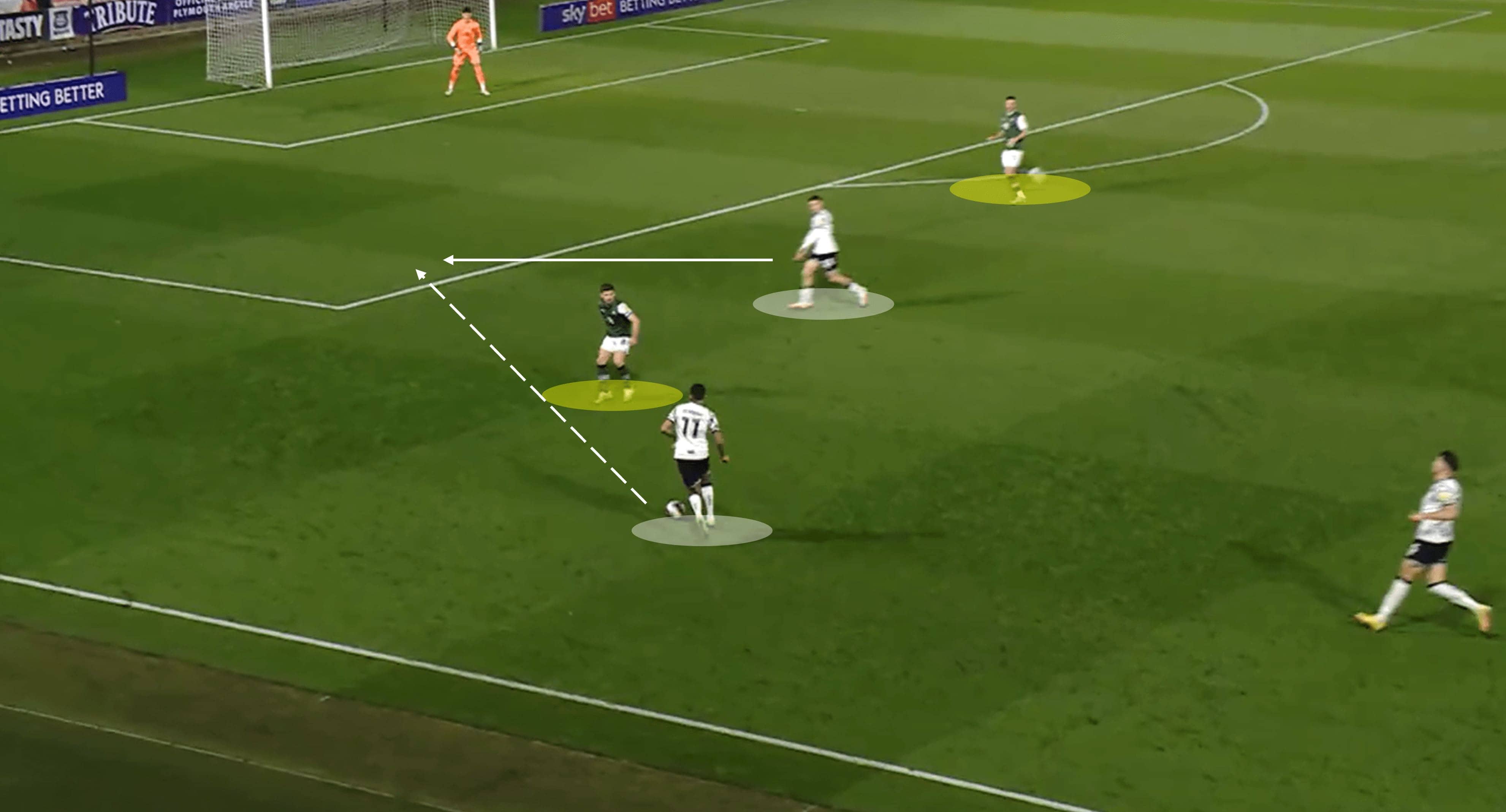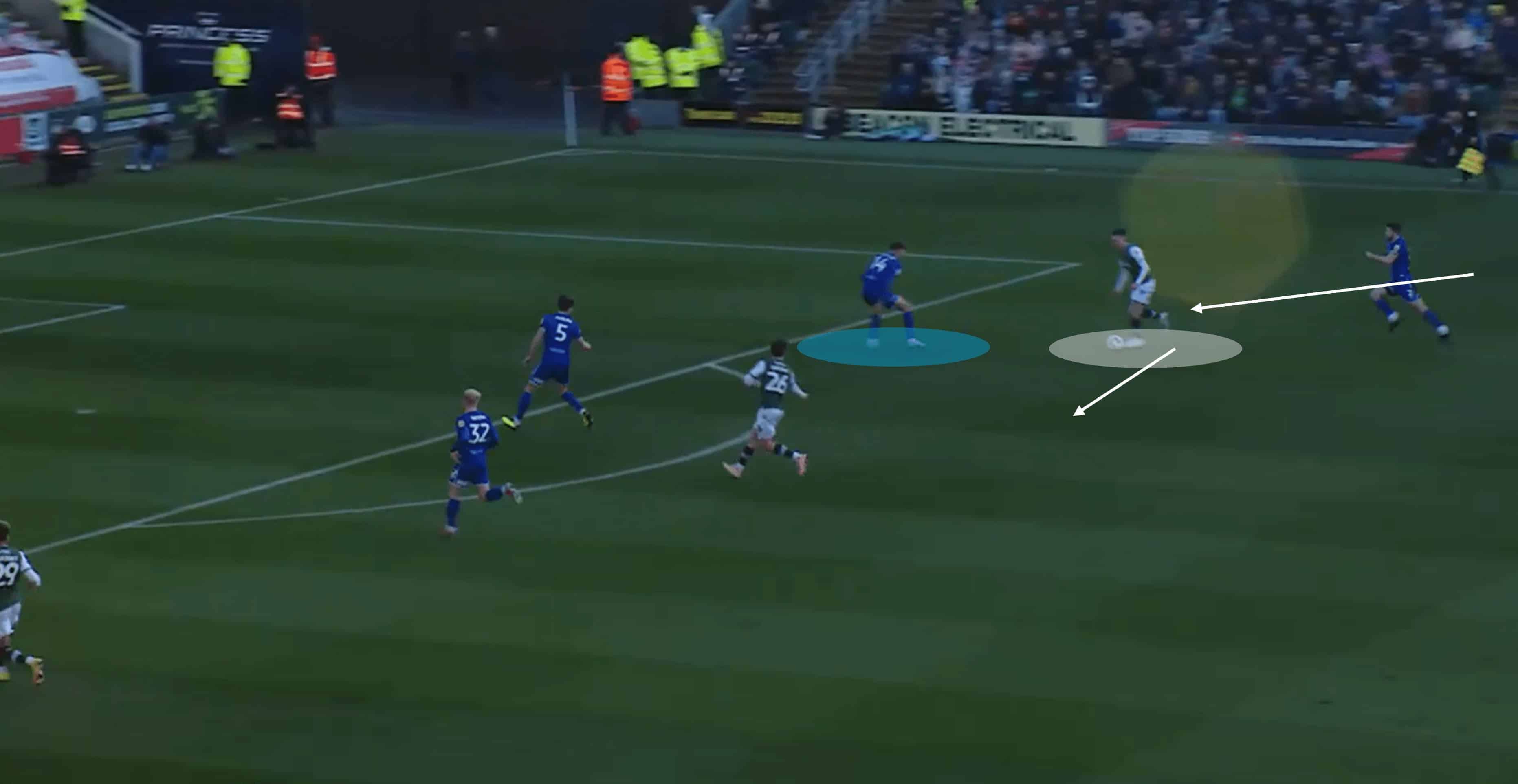 In the image above, the Plymouth midfielder cuts a clever blind pass through the two nearby opponents to find his teammate in acres of space as he enters the opposition half.