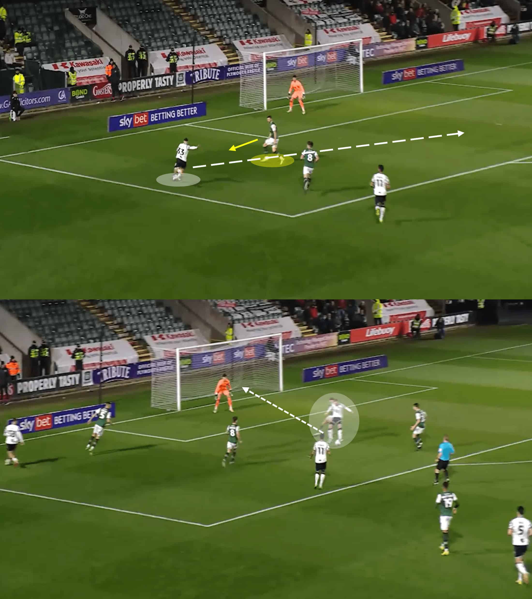All good goalscorers ignore teammates from time to time, and that is what we saw here as the Argyle winger drove into the final third at pace, with the opposition defender clearly struggling to contain the eventual goalscorer.