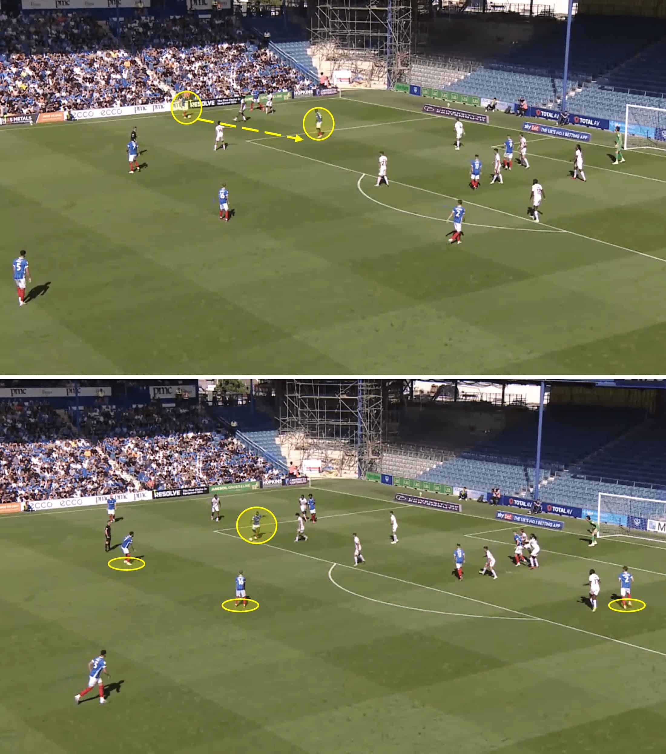 The majority of Portsmouth’s goals and promising attacks have come from wide areas, and they have also displayed signs of strength from set-pieces too. While attacking the flanks isn’t a groundbreaking tactic from Mousinho, the way his team executes the build-up phase to eventually shift the ball into wide areas is extremely effective. Utilising both teamwork and individual ability, Portsmouth are a very dangerous team when attacking from the flanks.