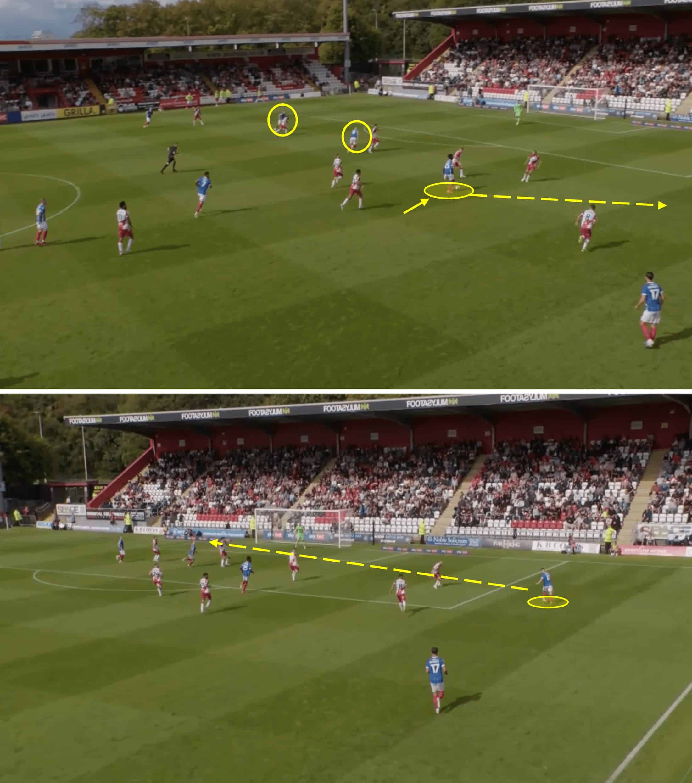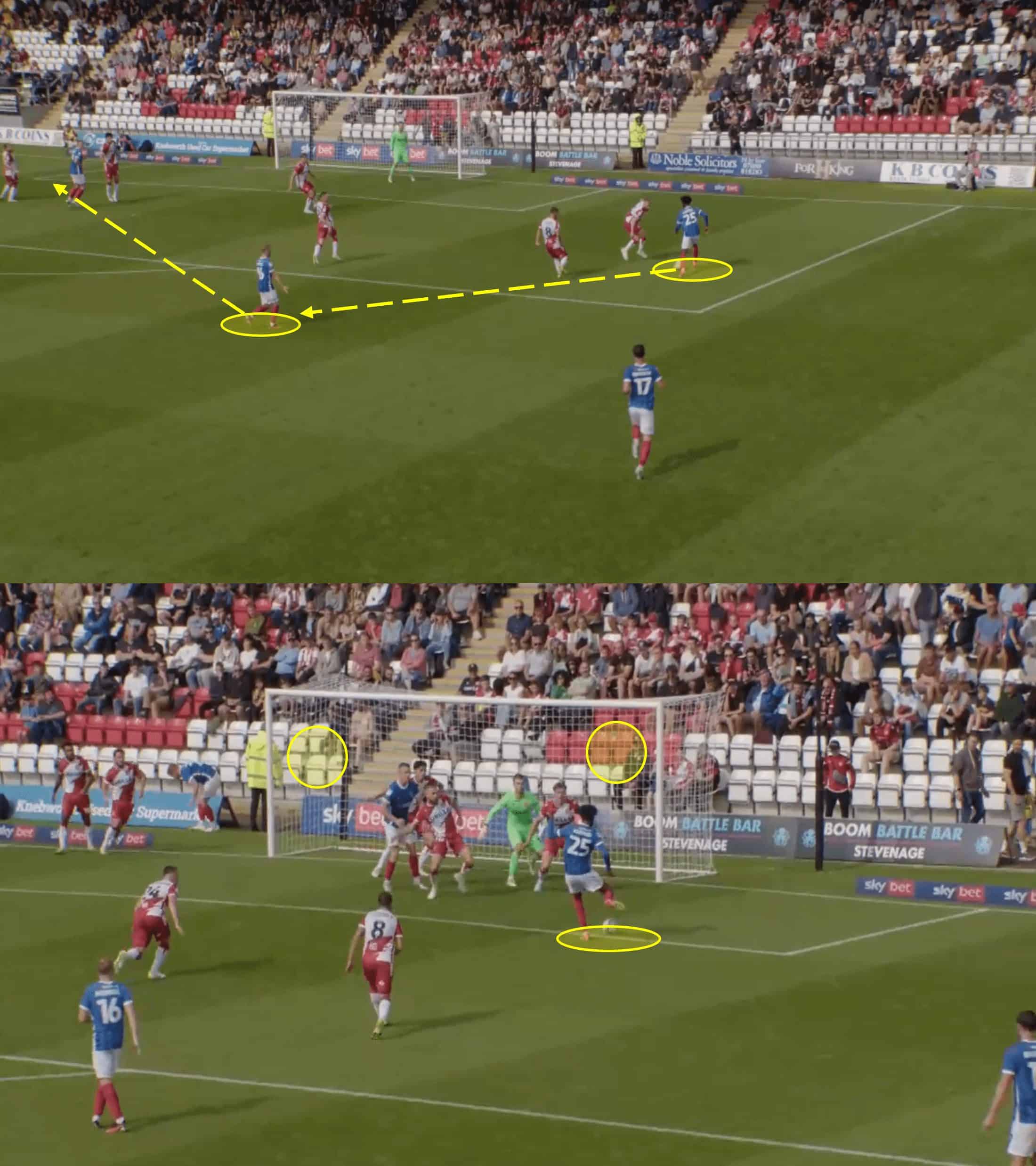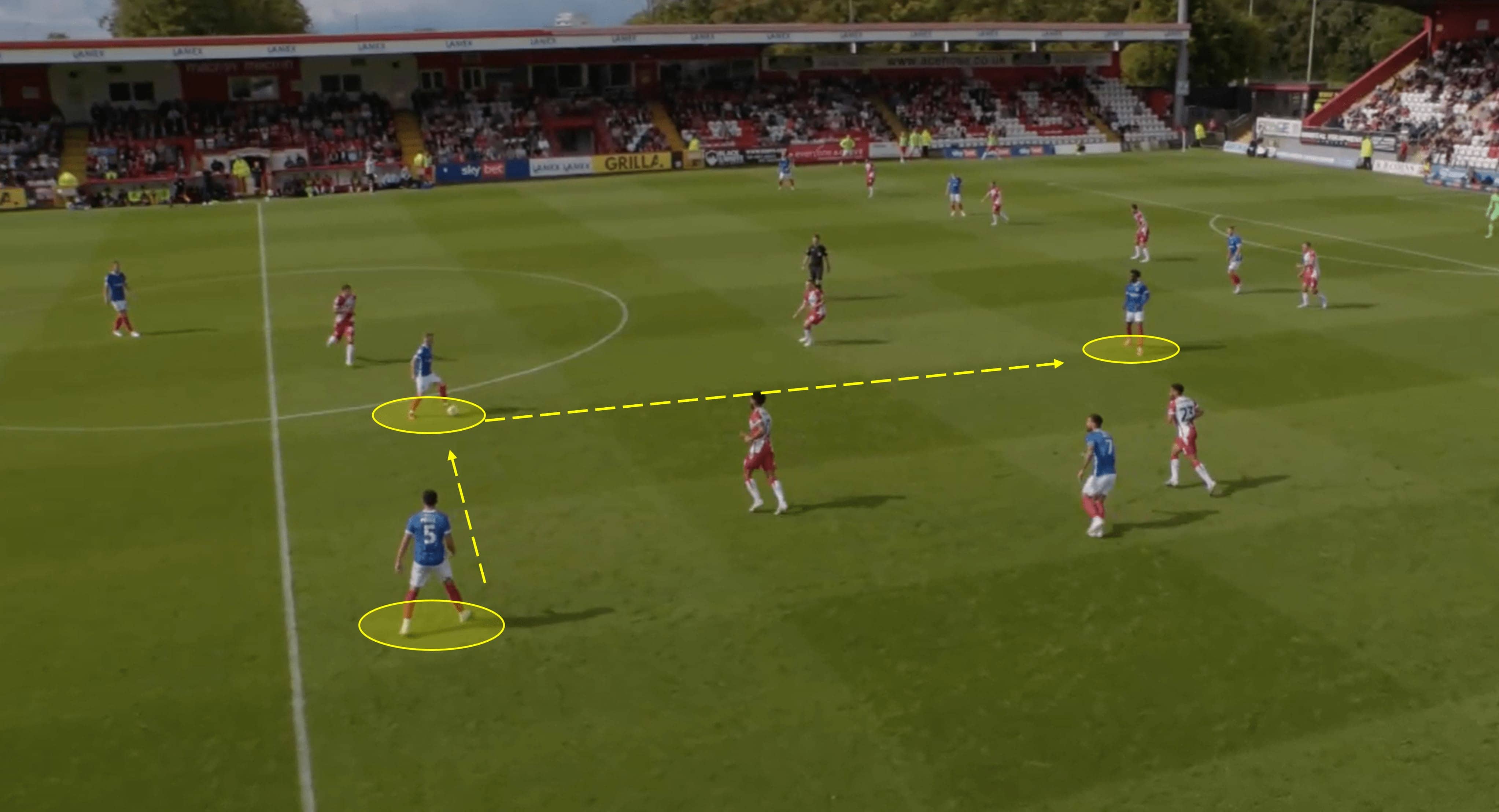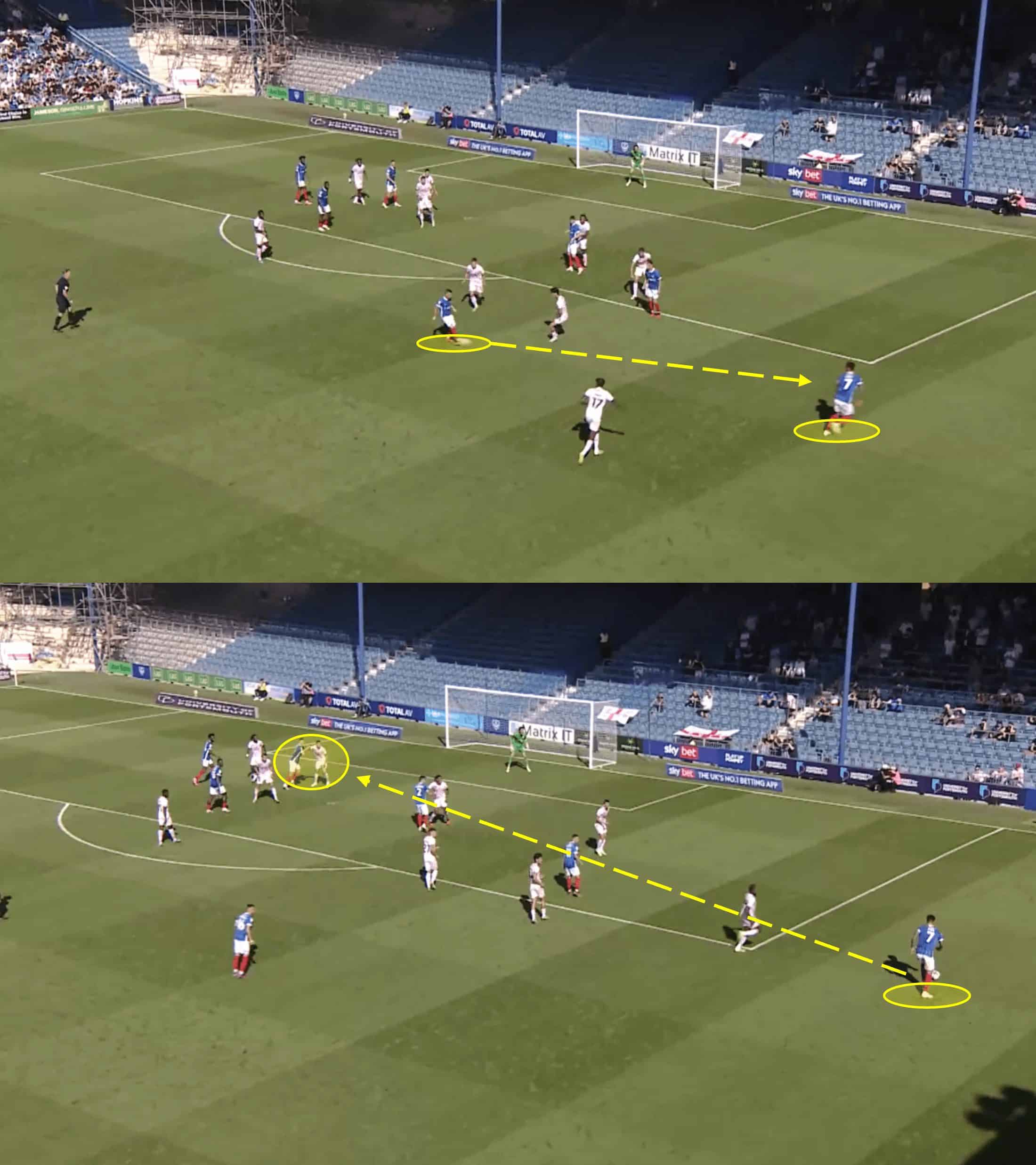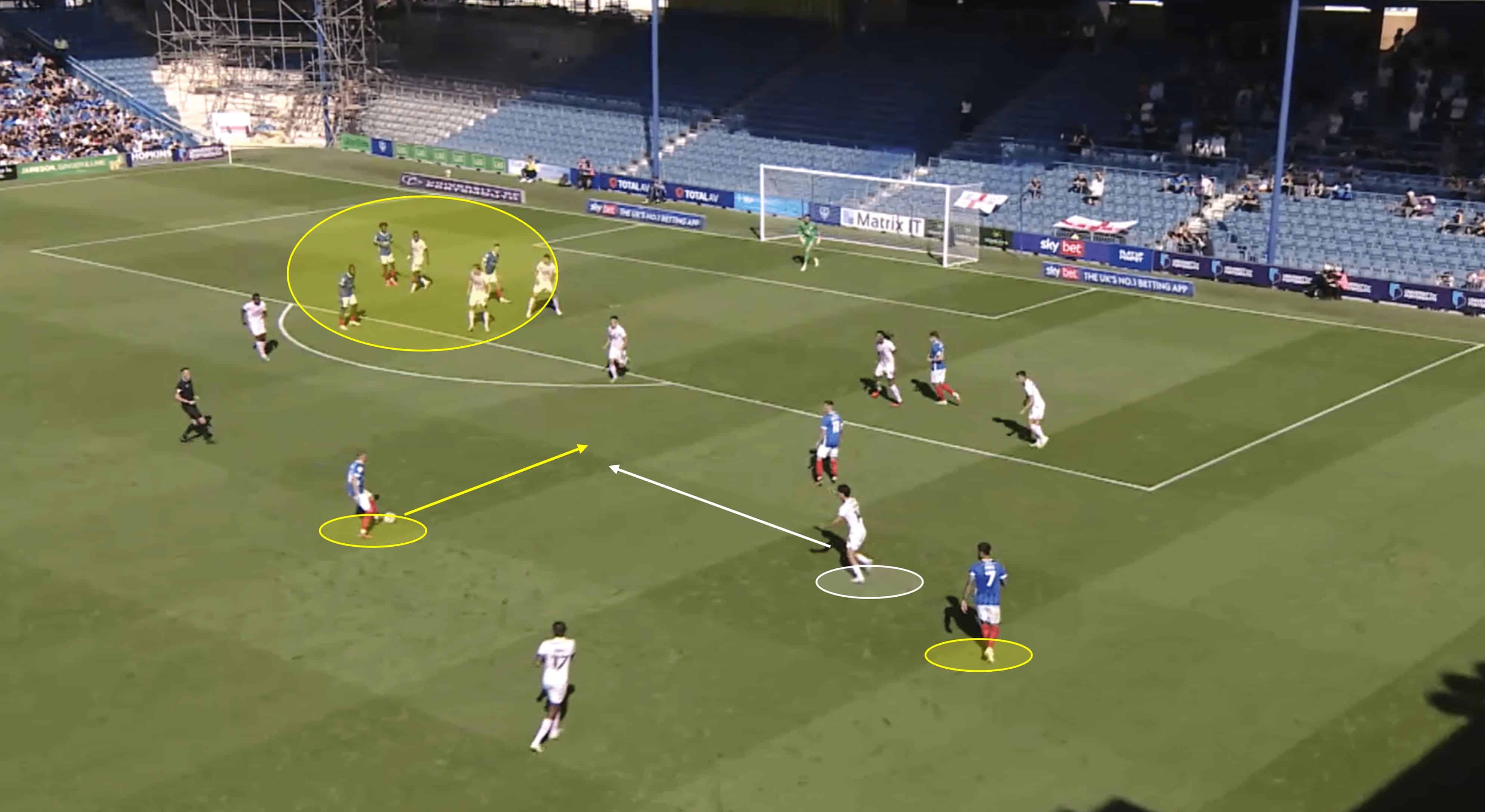Another positive and noteworthy piece of statistical information is that so far this season, Pompey have been consistent in controlling possession – they rank second in the league for average possession after six games, averaging 57.7%. They often use this time on the ball to move the opposition as they look to open up space in more attacking areas, just like we see in the example above.