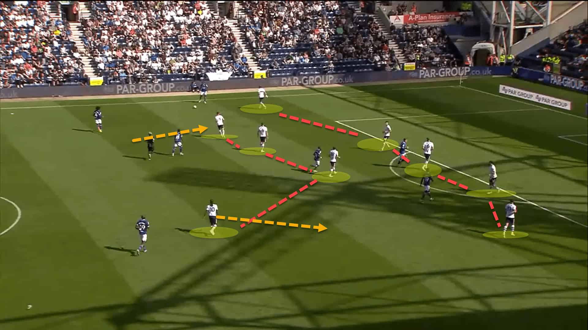 When the ball is in the central areas, Preston’s structure remains as a 5-2-3 but once the play is moved to the wide areas, the wingers push wider and drop off, forming a 5-4-1 shape.
