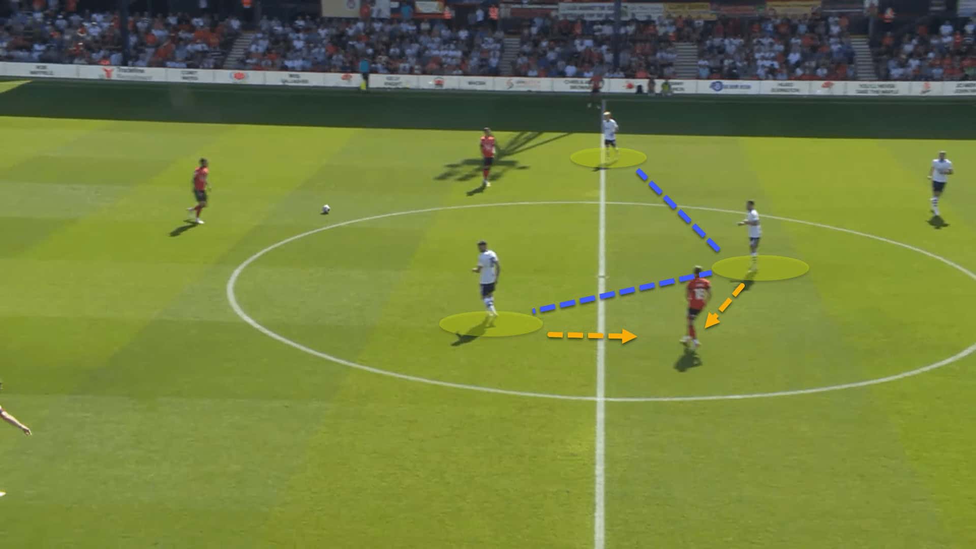 As portrayed in the previous image, Preston regain possession in a low block state, but Luton’s aggressive counterpress forces their counterattack to break down almost instantly.