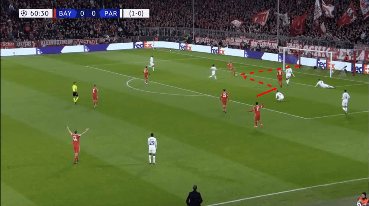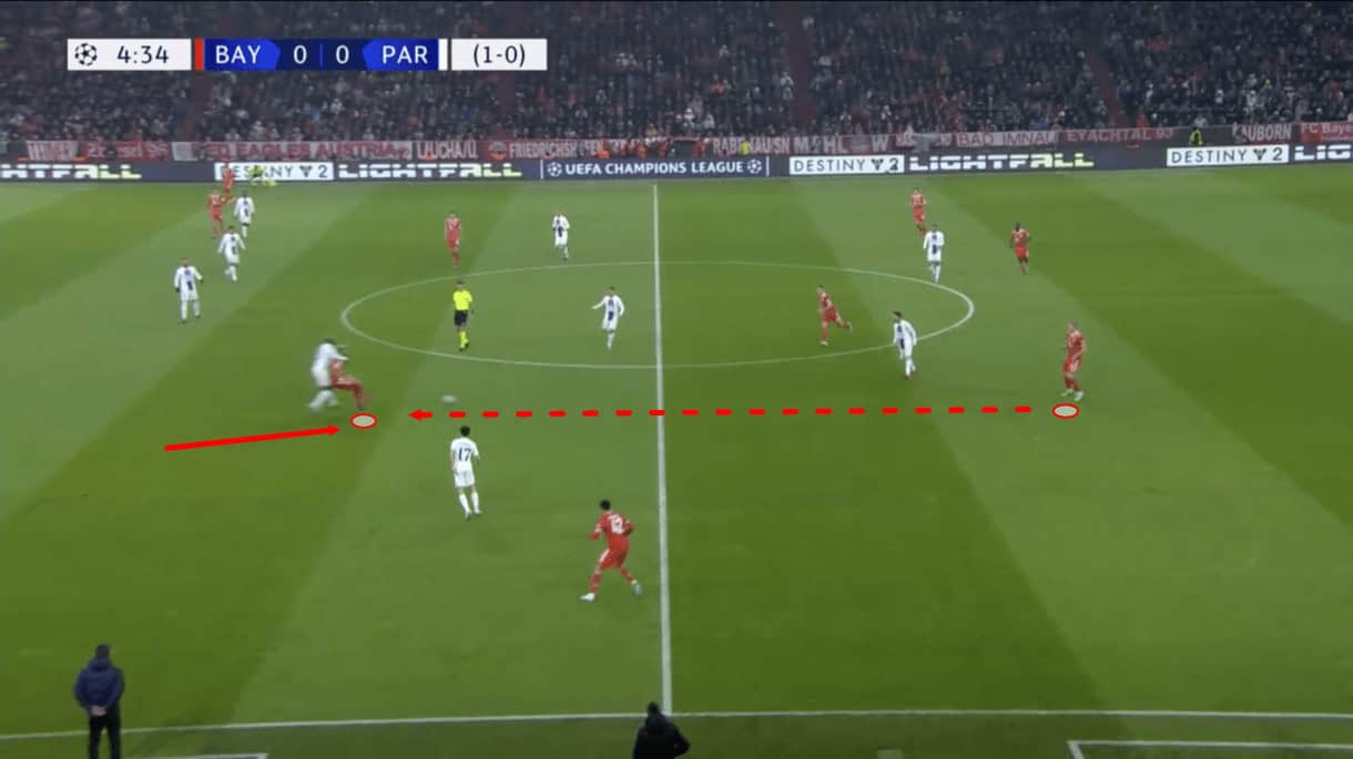 Here, we see a typical example of a Bayern build-up sequence from Wednesday’s game. In contrast to PSG, there’s immediate verticality. Players are looking for forward passing options and daring to make use of them as quickly as possible while remaining reasonably safe. There was much more dynamic movement from Bayern’s attackers and midfielders to give the backline options when looking to progress. This is, again, in contrast to PSG whose attackers and advanced midfielders didn’t offer enough dynamic movement, leading to lethargic build-up.