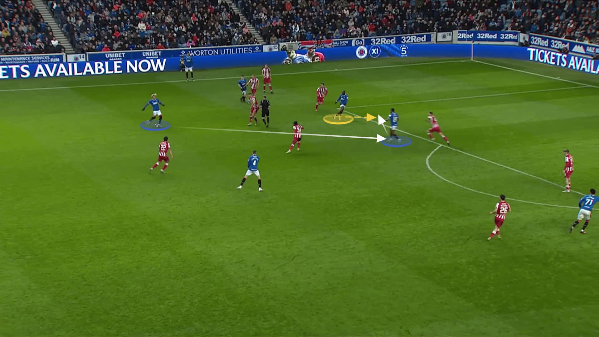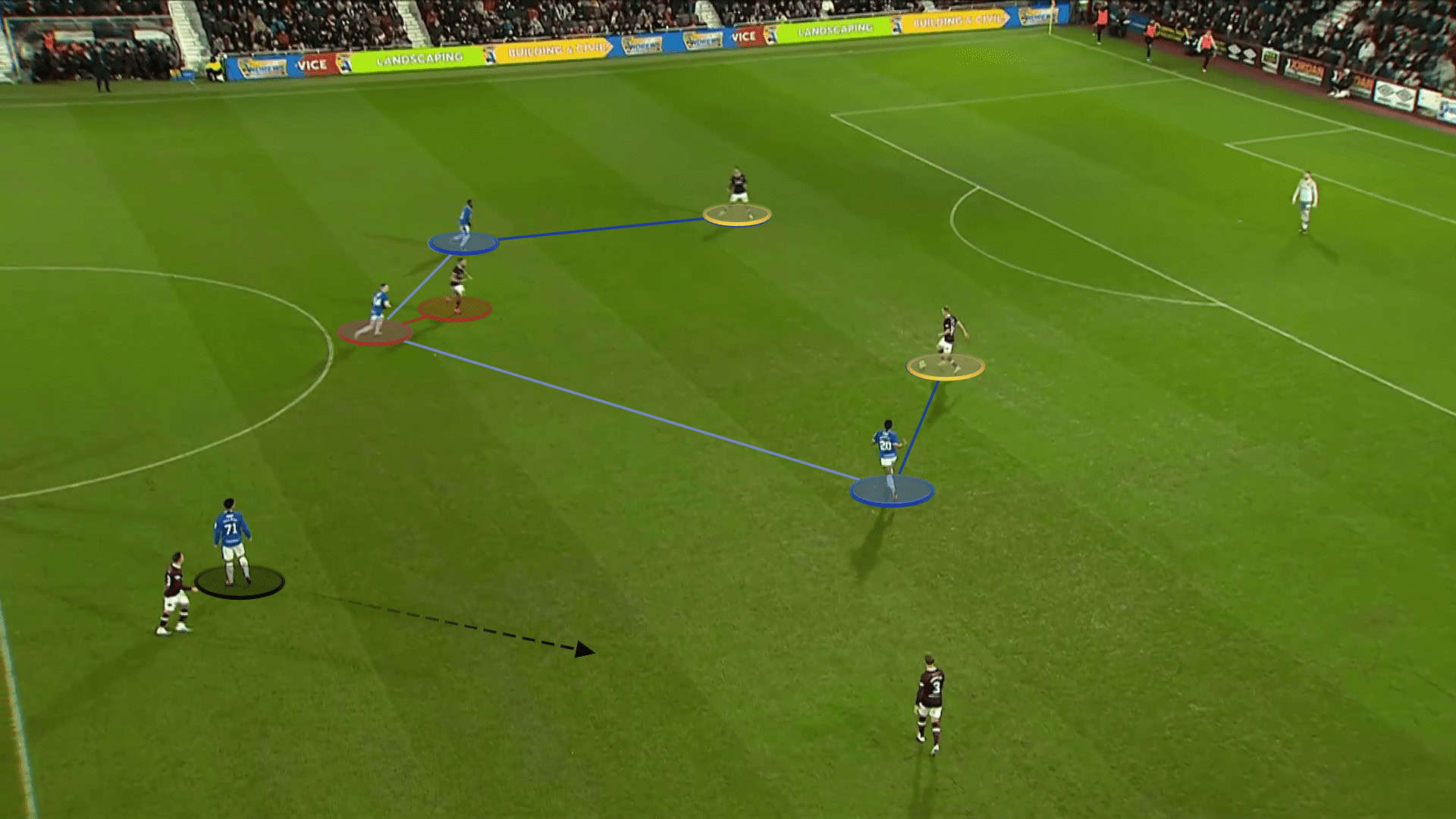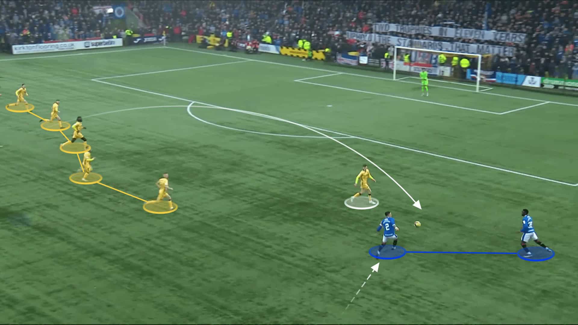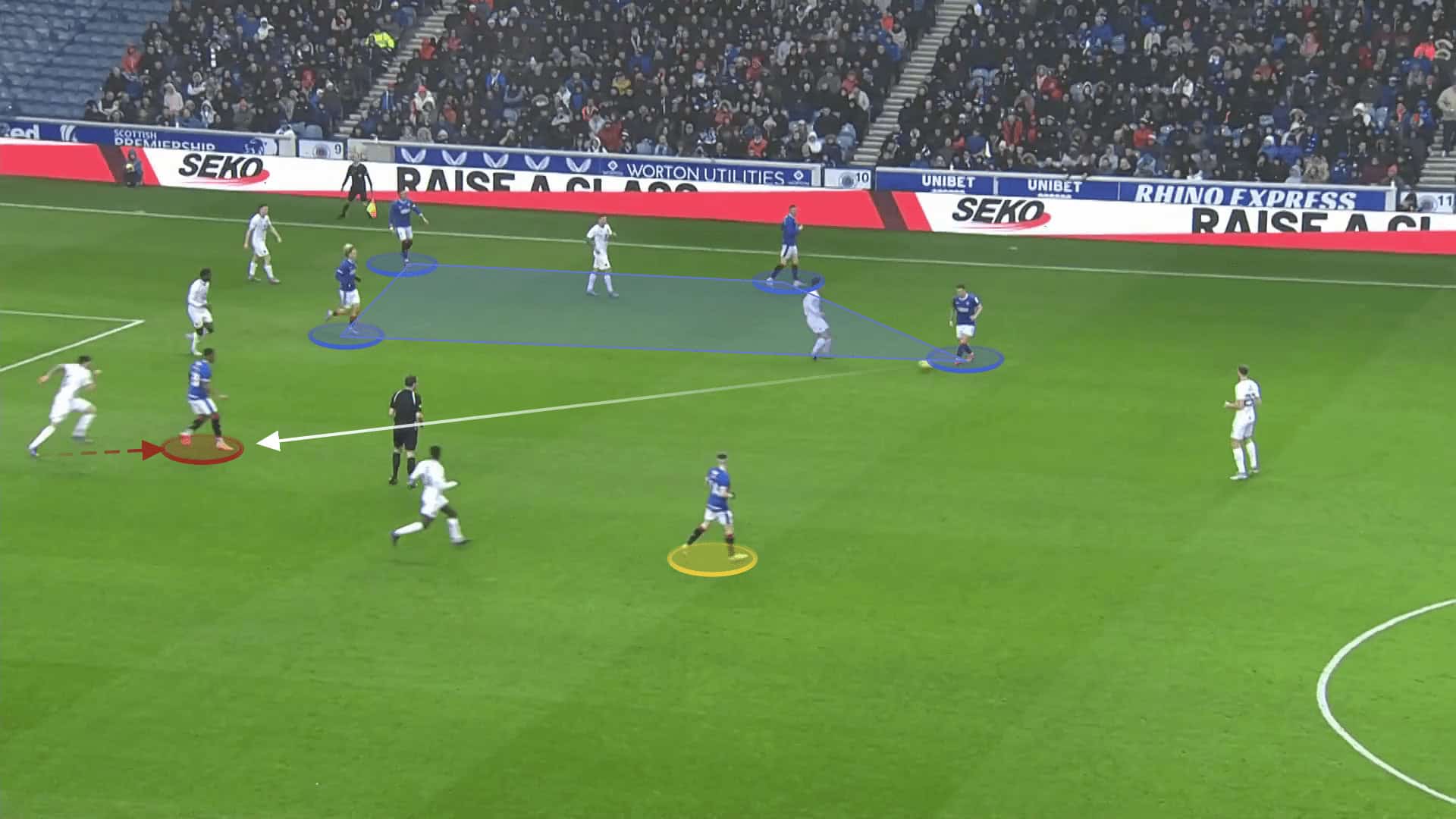 Rangers, here below, are overloading the right-hand side under the same conception of Beale’s freedom and fluidity. Controlling the flank with four players with an option to circulate to the weak side and an aid from the dropping striker creates a numerical advantage and provokes the opposition’s centre-back to leave his position.